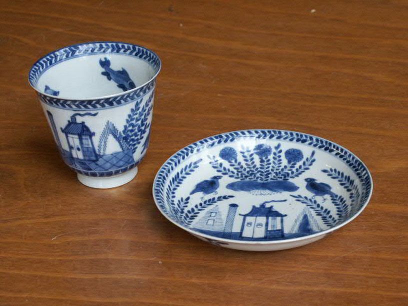 14 koppen en 15 schotels met decor van waterlandschap