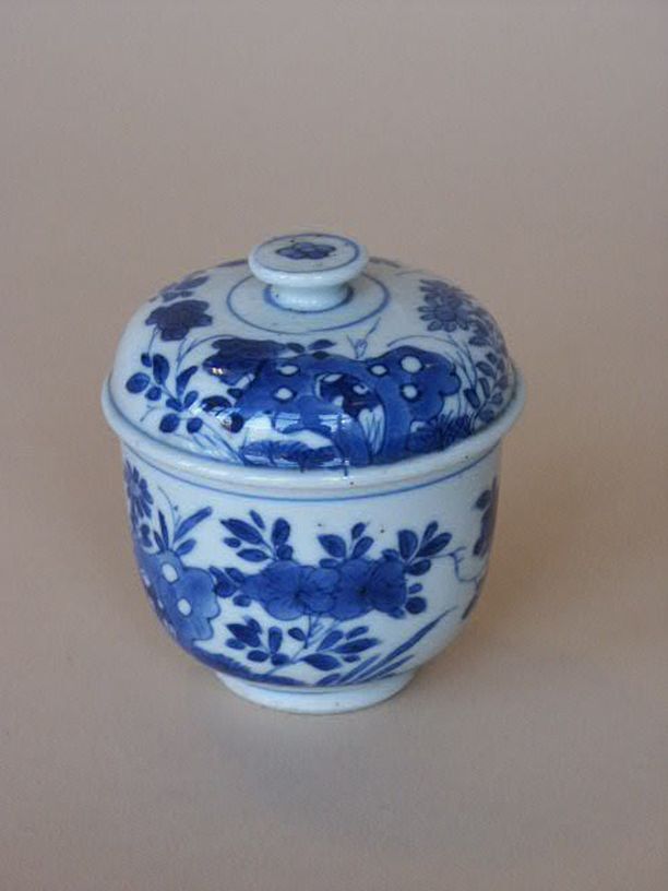 Kan met deksel met blauwwit decor van 2 velden met e...