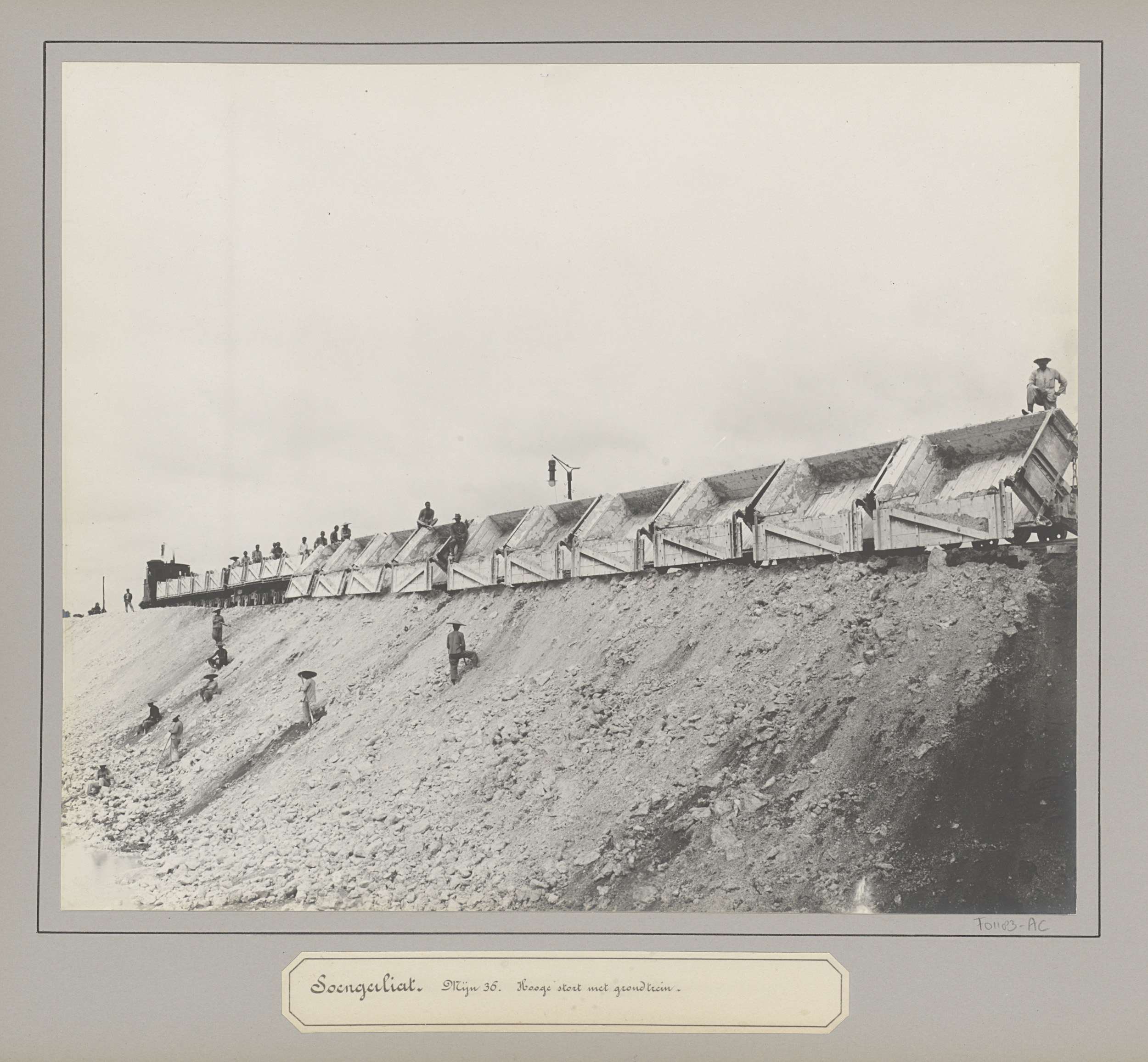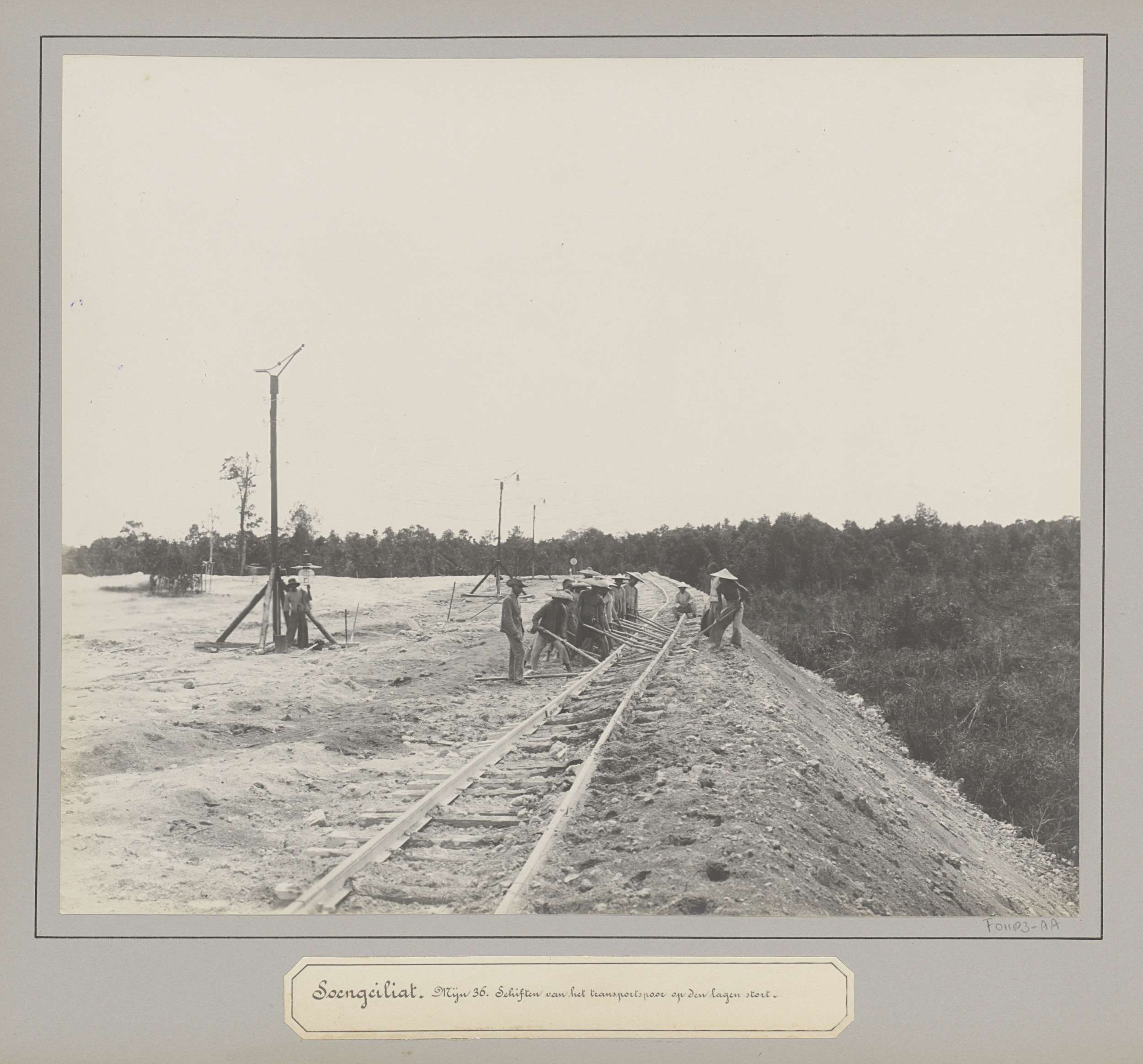 Werknemers verplaatsen spoorrails bij tinonderneming...