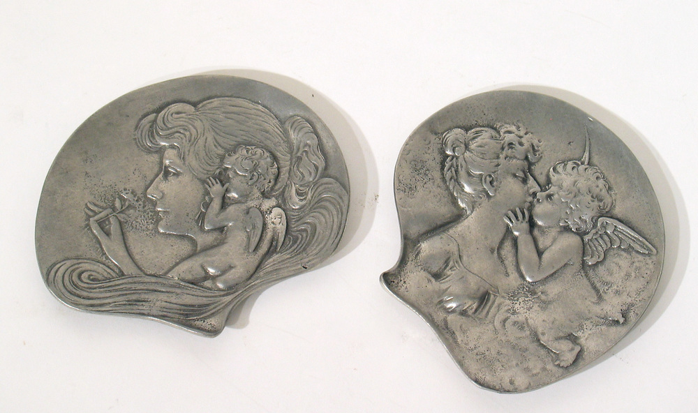 Schaal van tin in schelpmodel met afbeelding van vro...