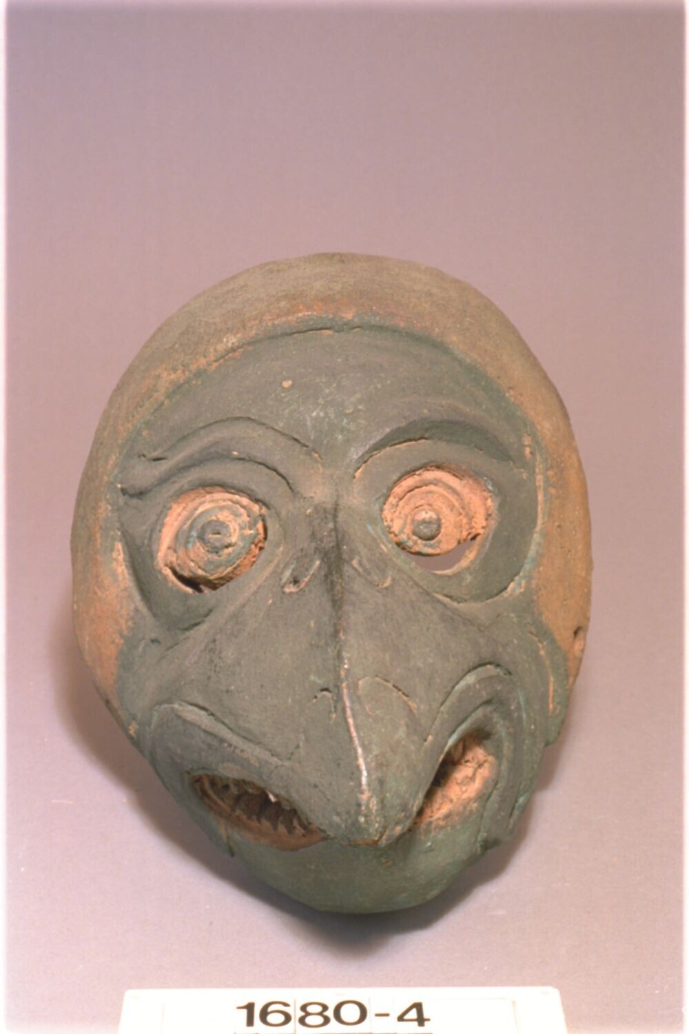 Masker van gebakken aarde van een vogel, mogelijk Ja...