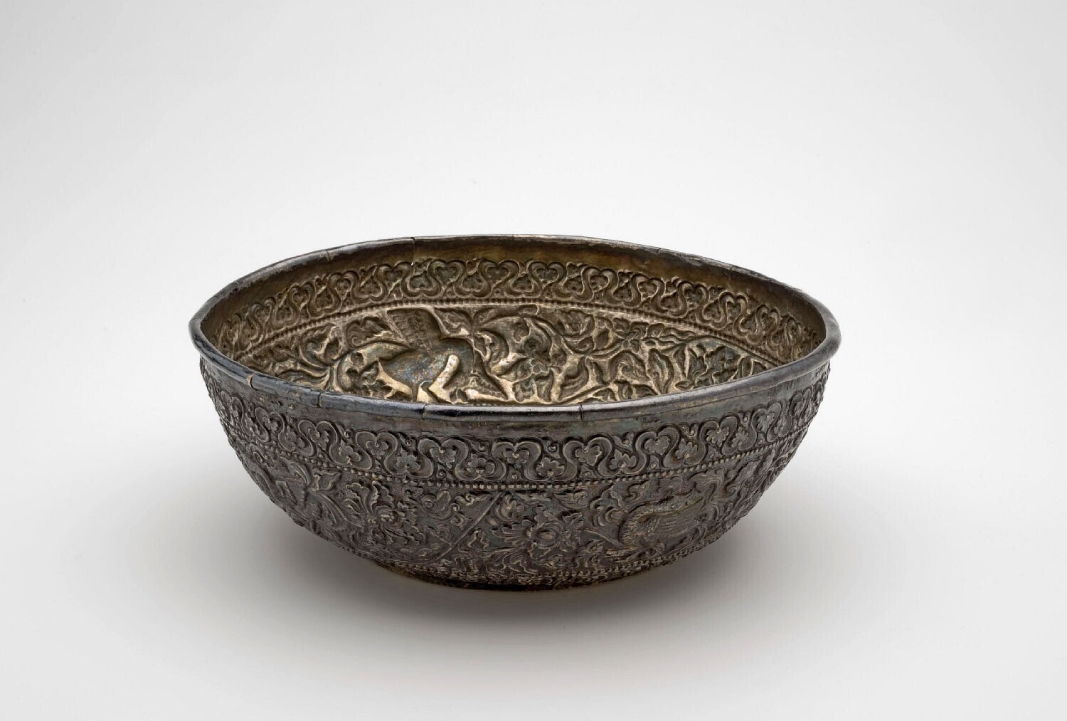 Zilveren kom, versierd met gedreven vogelfiguren