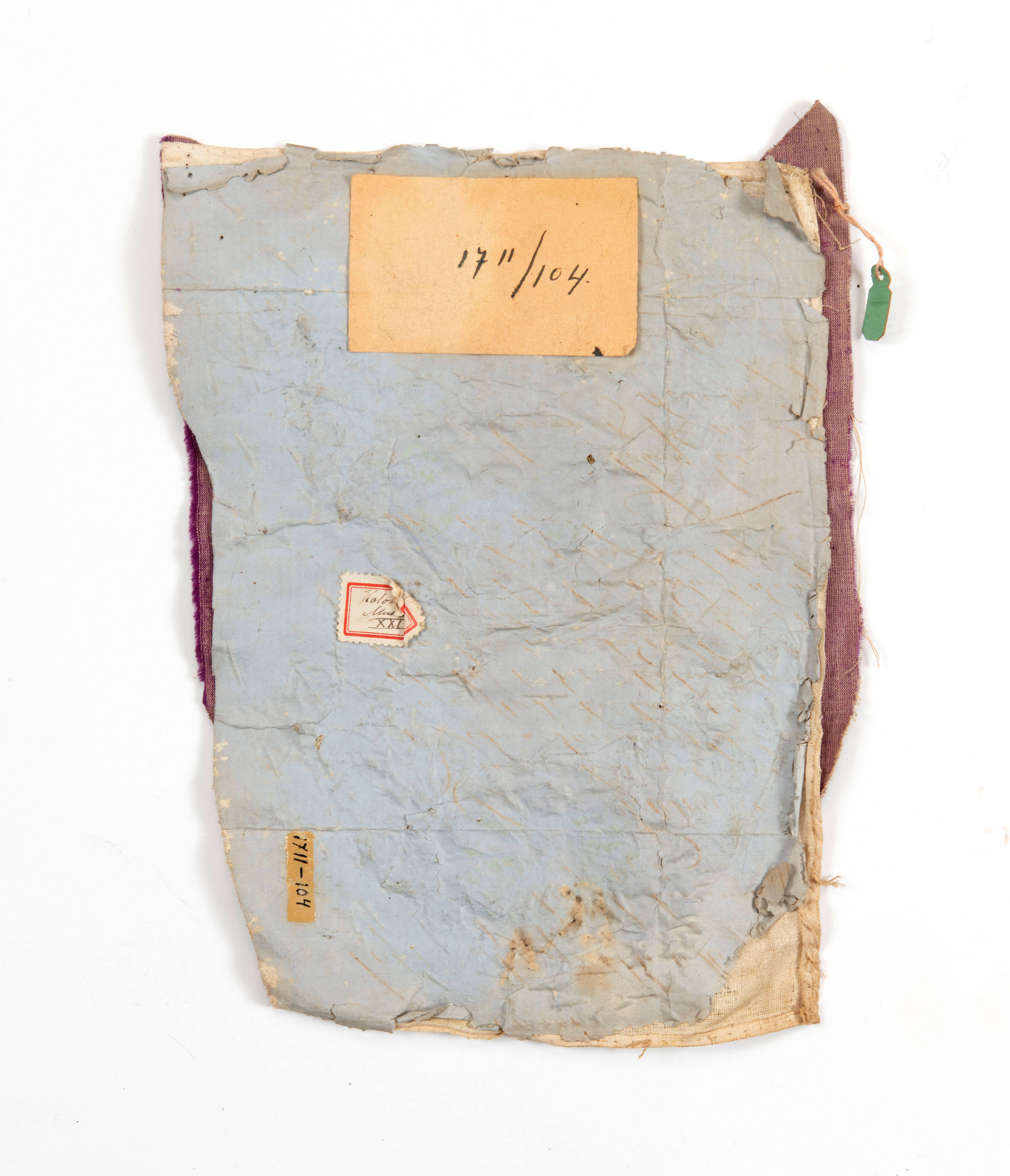 Borduurwerk op paars fluweel, bestemd voor sloffen