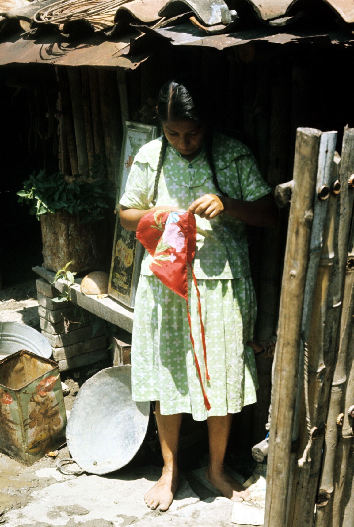 vrouw bij choza, handwerkend