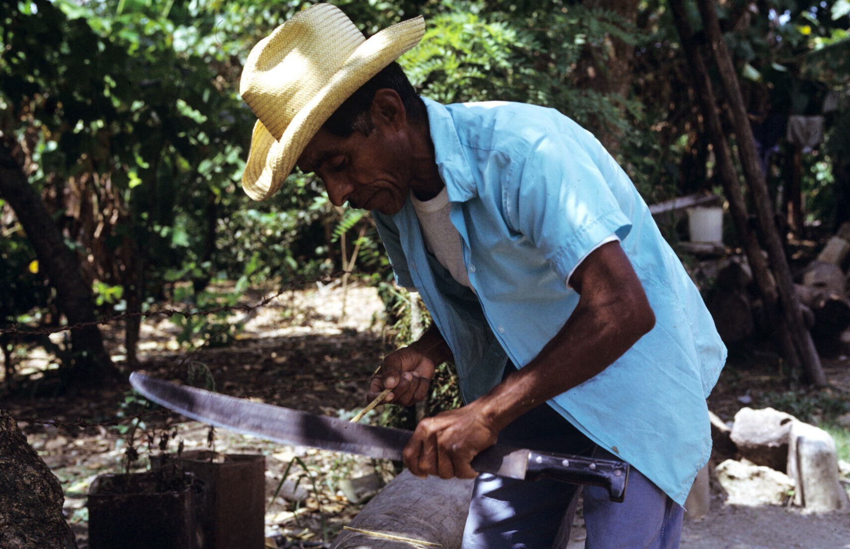 man met machete bij akker