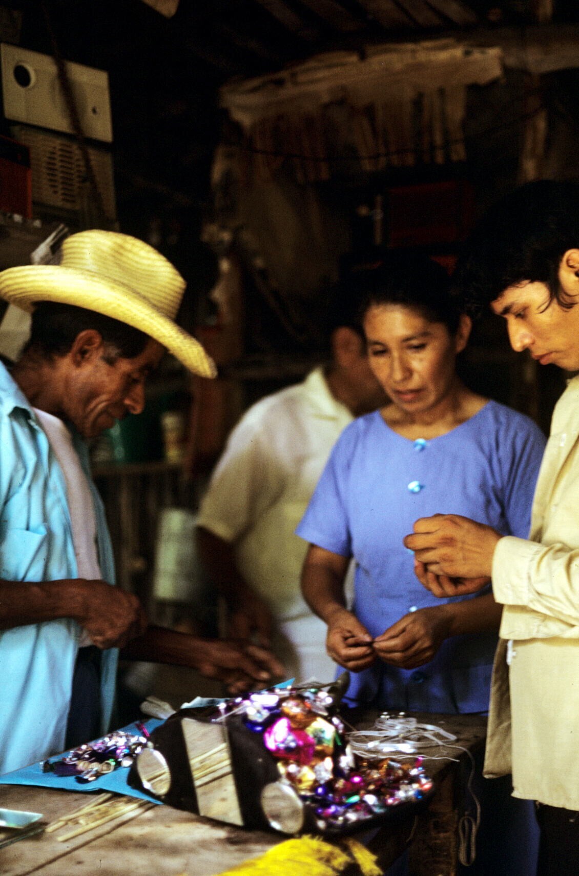 het naaien van versieringen op 'Negrito' hoed