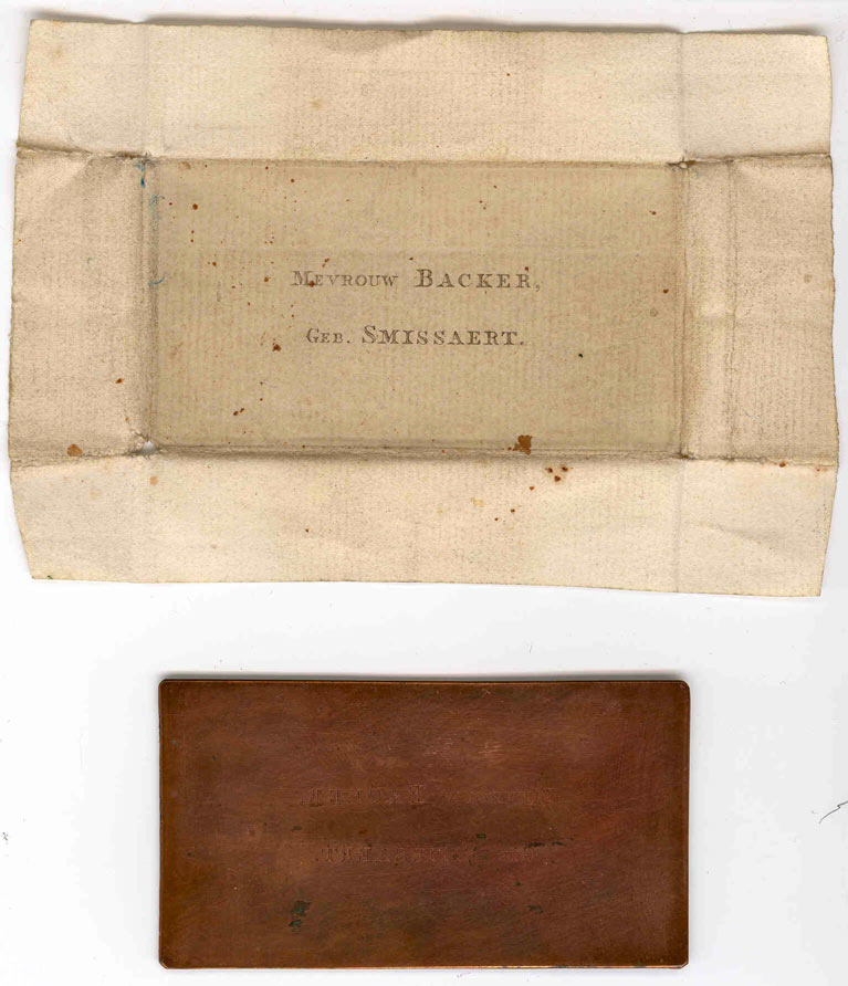 Visitekaartje en drukplaatje van Mevrouw Backer-Smis...