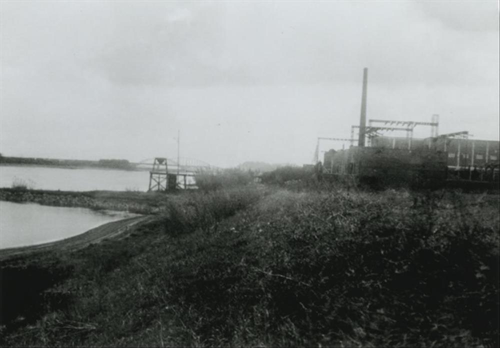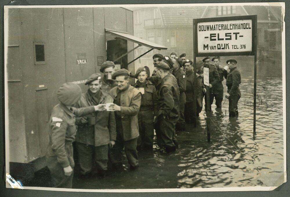 Soldaten rond een Y.M.C.A. tea car in overstroomd Elst.