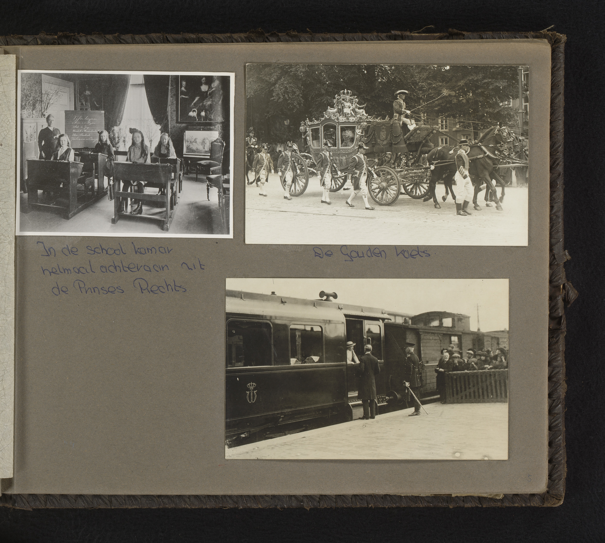 Drie foto's van prinses Juliana als kind, in de les,...
