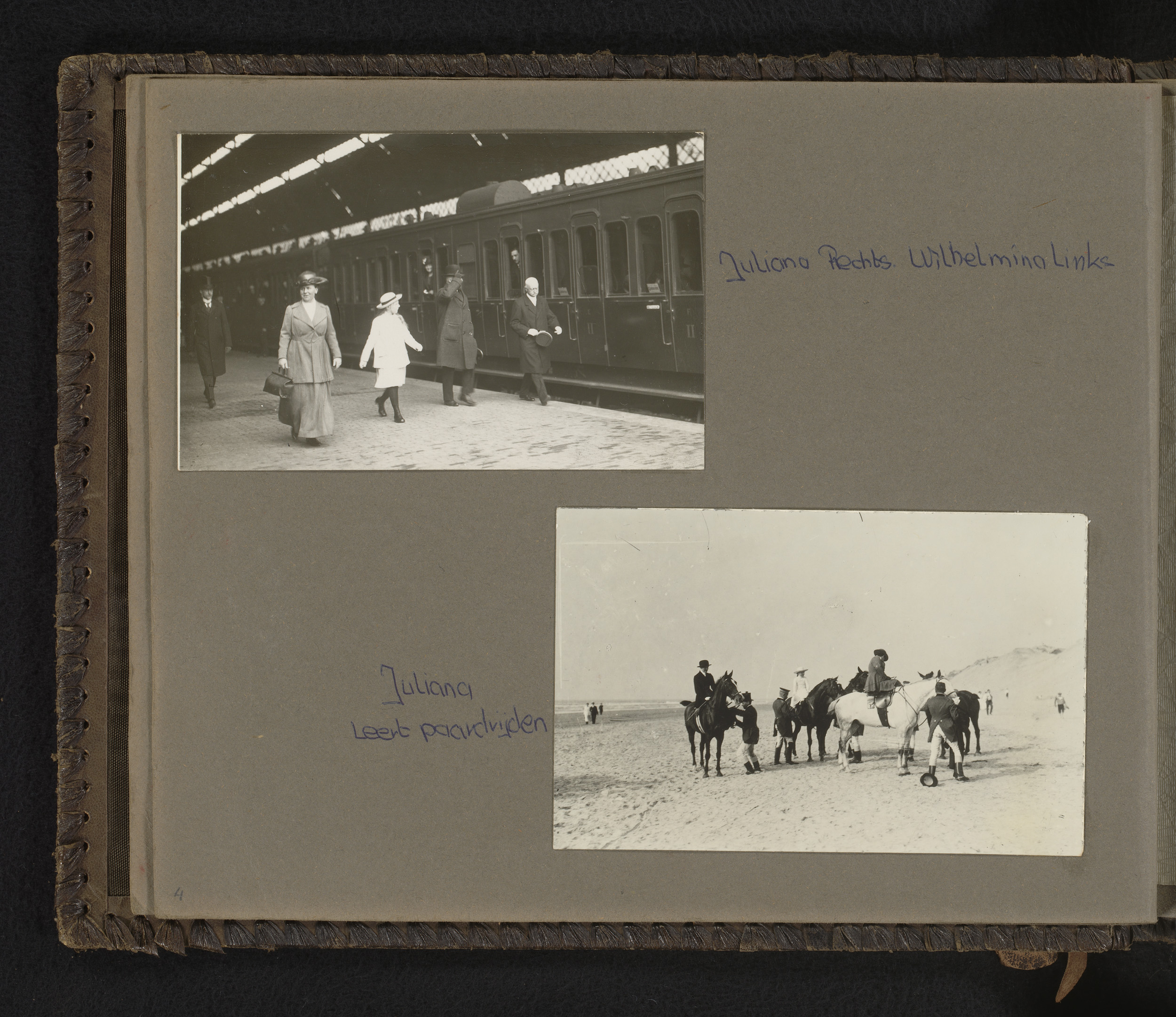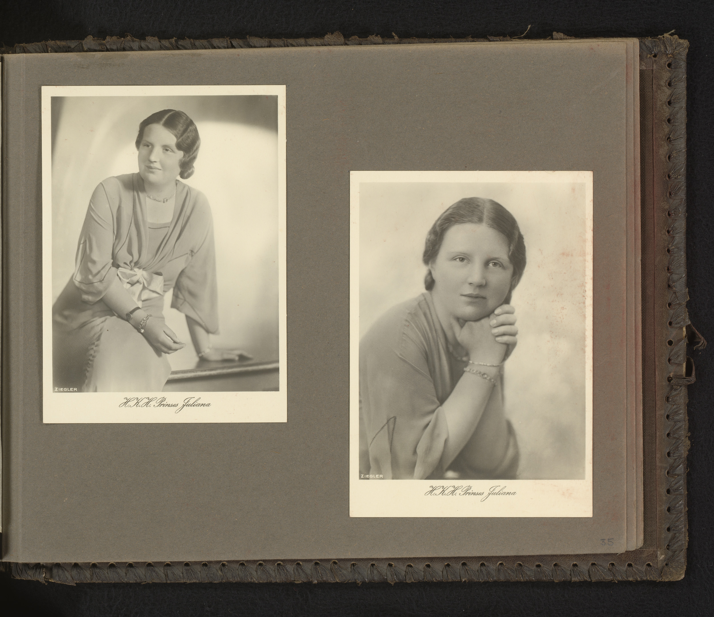 Twee foto's van prinses Juliana als kind, op een sta...