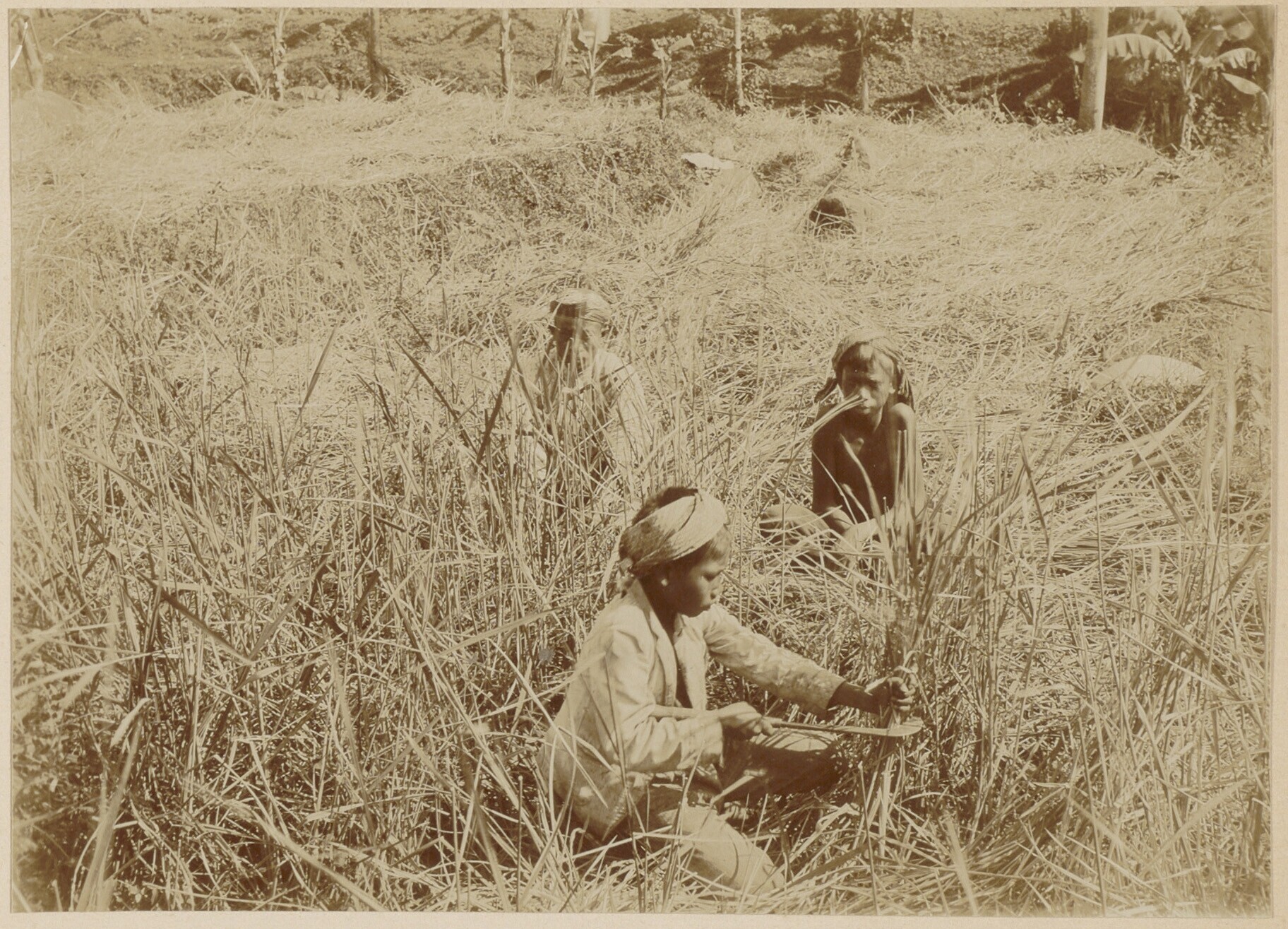 Javaanse vrouwen aan het werk op rijstvelden op Java