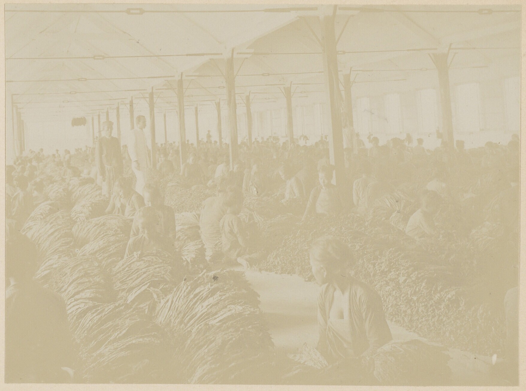 Javaanse arbeiders rijgen tabaksbladeren in een loods