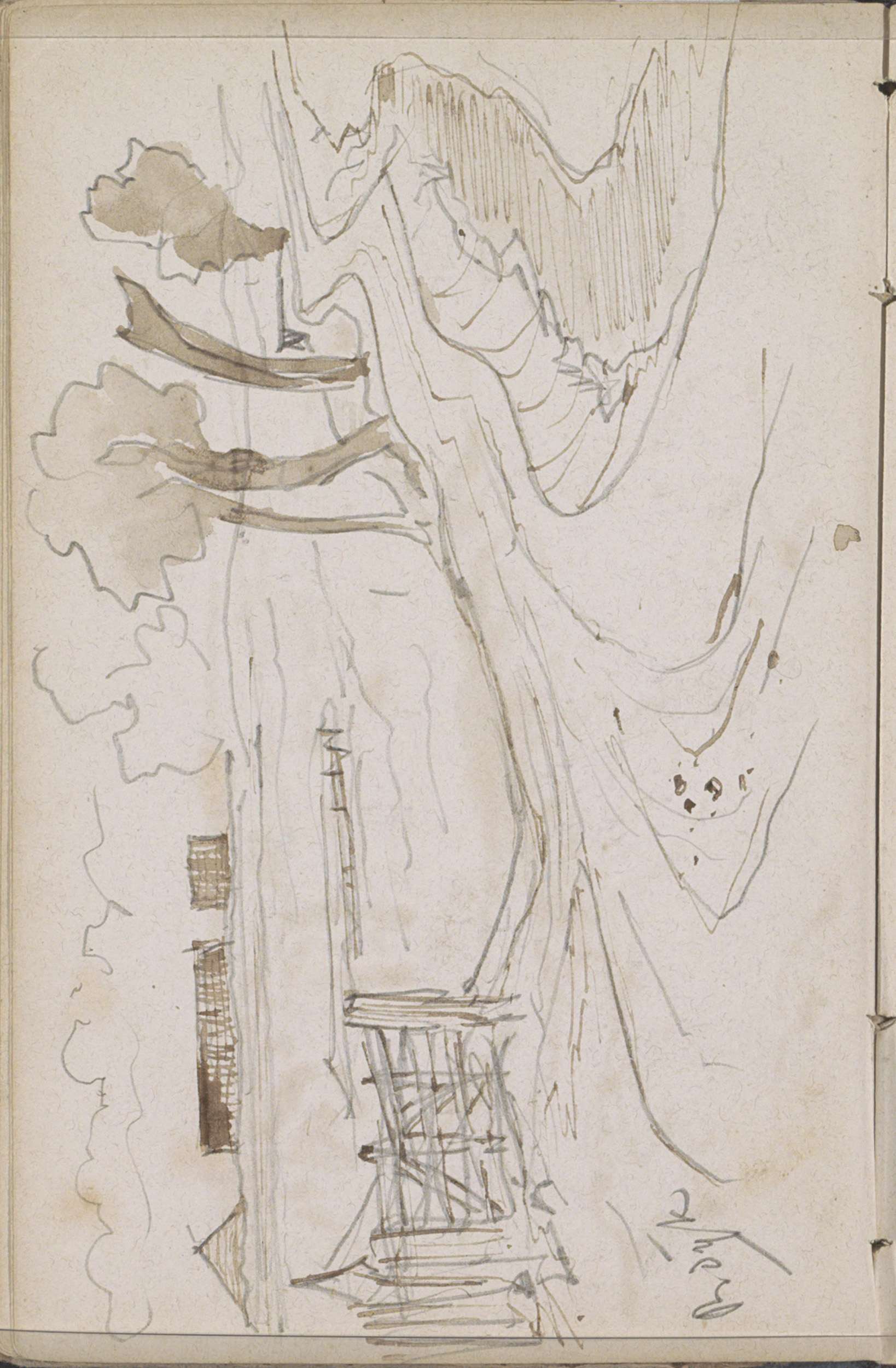 Landschap met figuren en een gebouw met een ronde toren