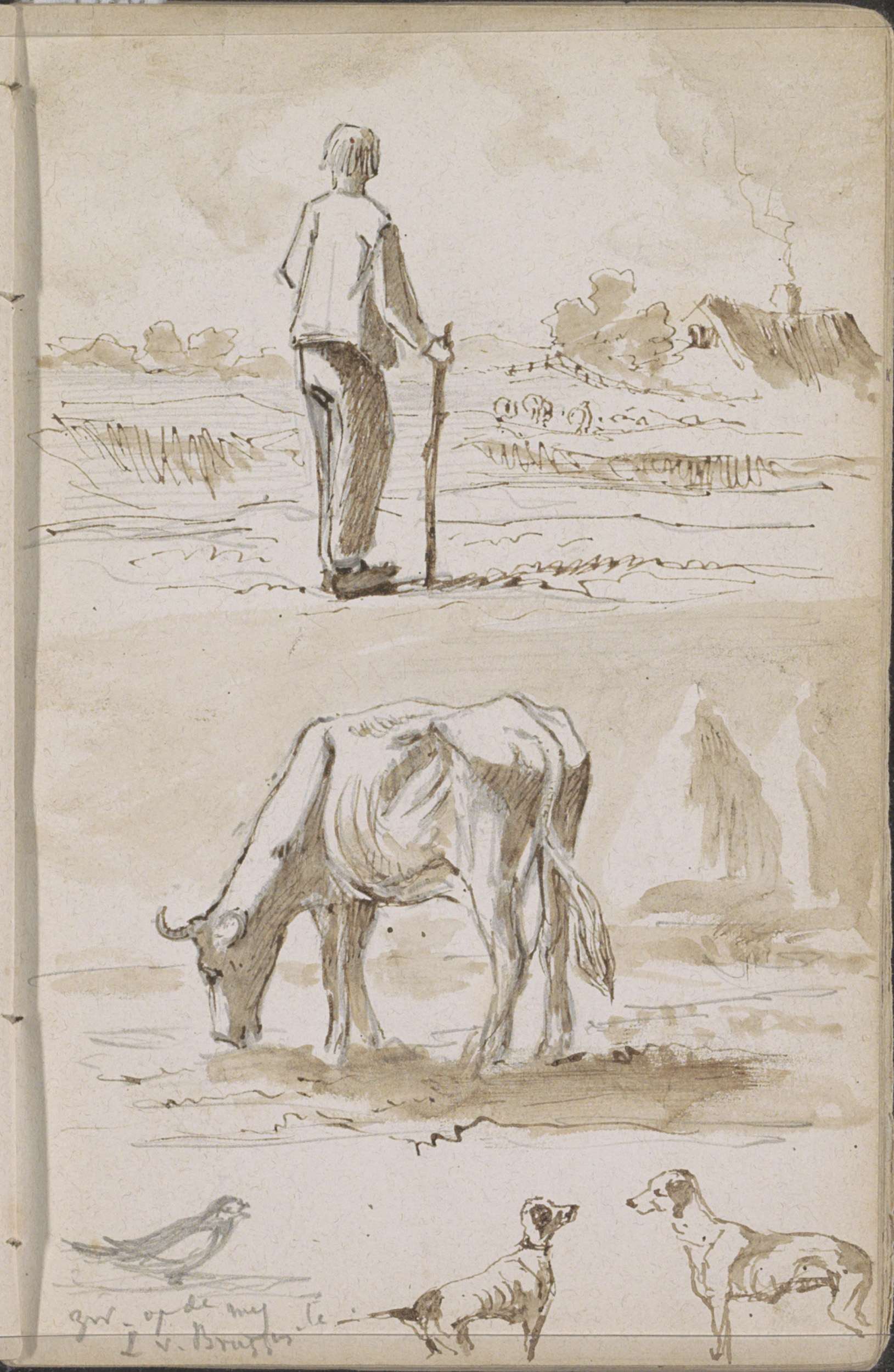 Man met een wandelstok en een grazende koe in een la...