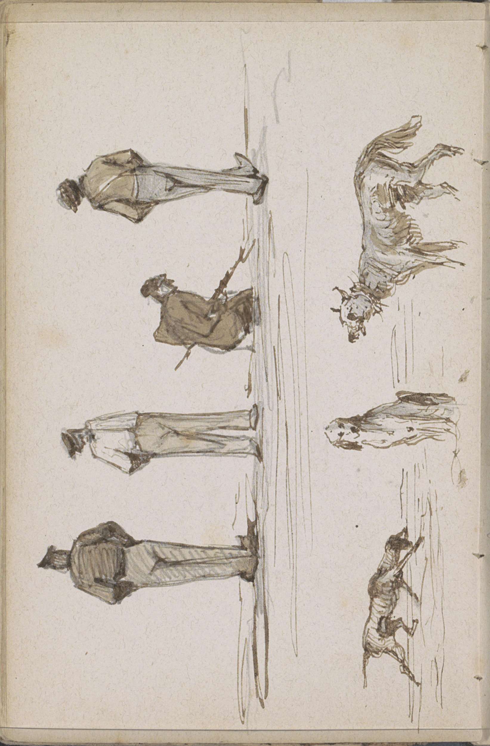 Drie staande en één hurkende man en drie honden