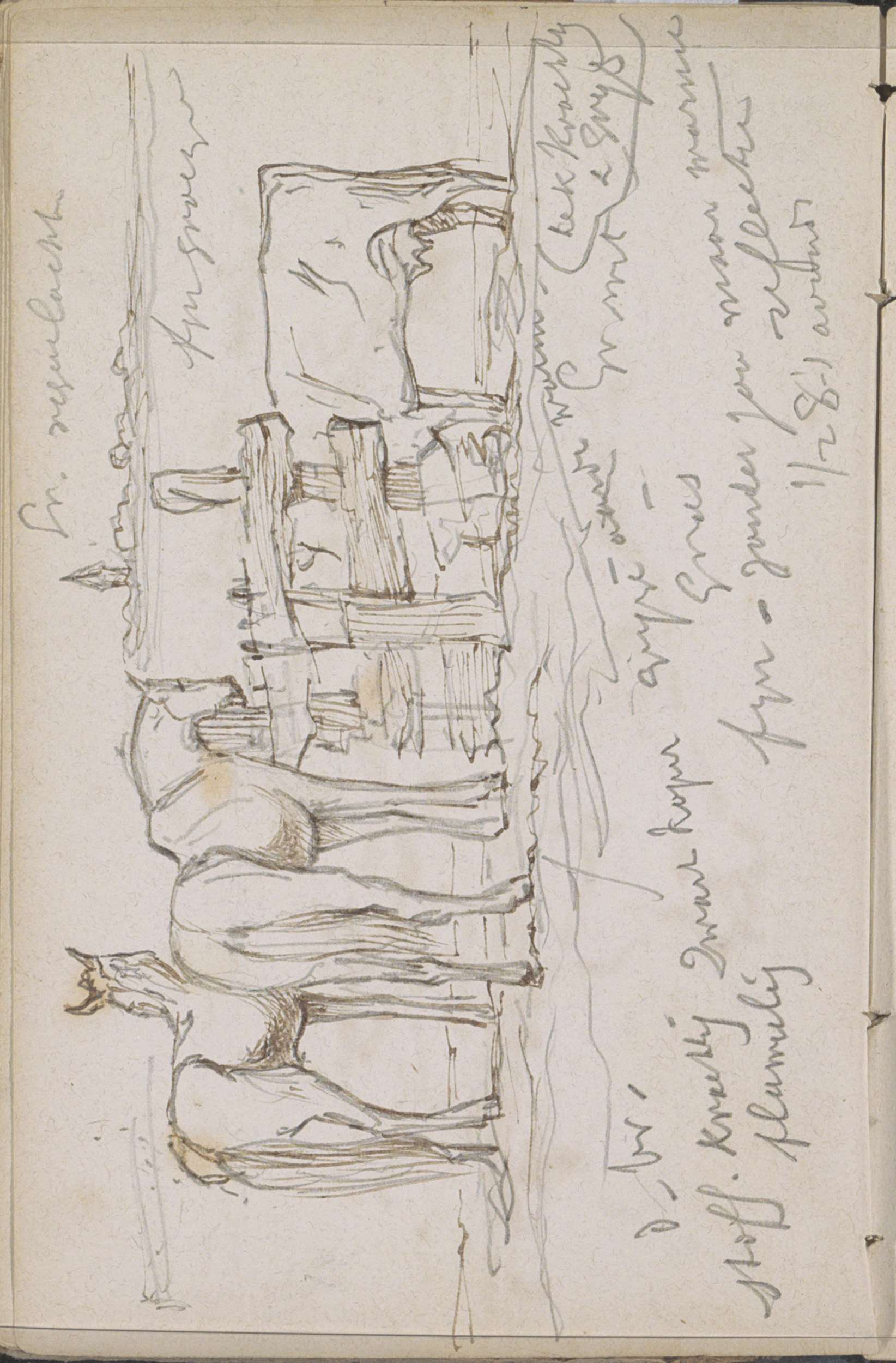 Twee paarden en een koe bij een houten hek