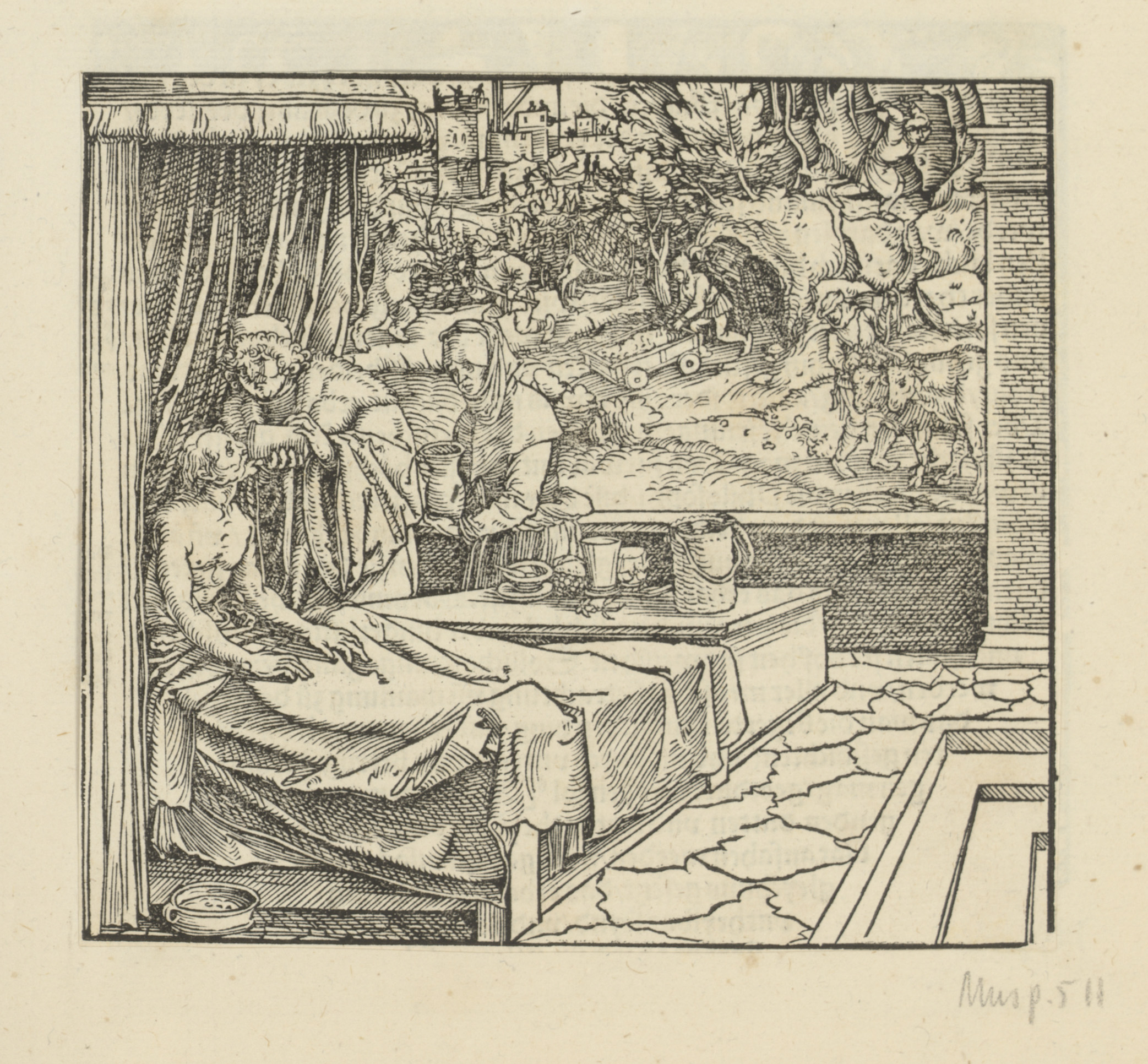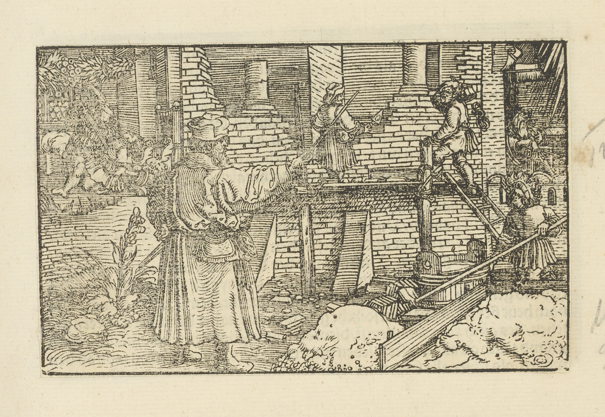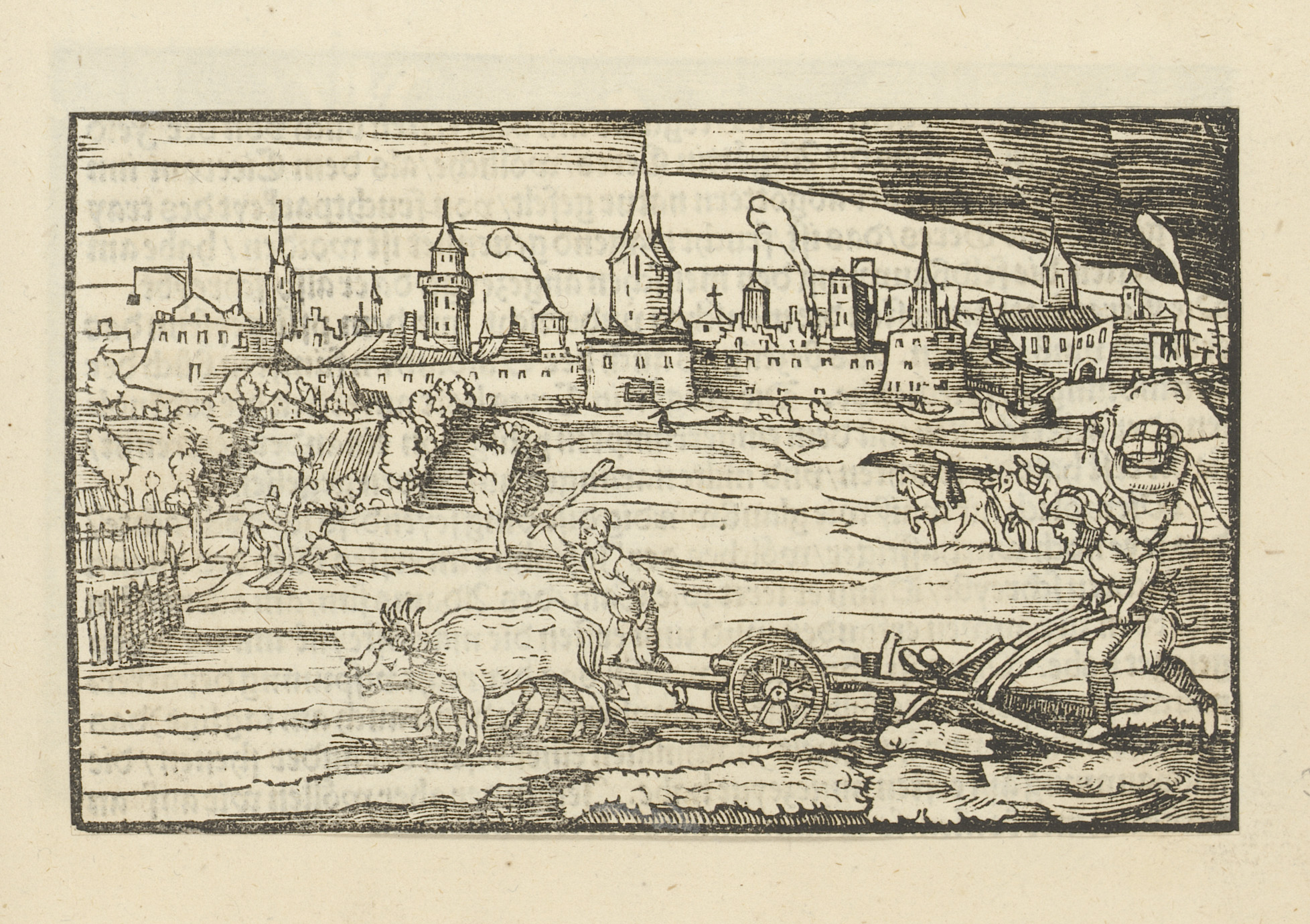 Ploegende boeren bij een vestingstad