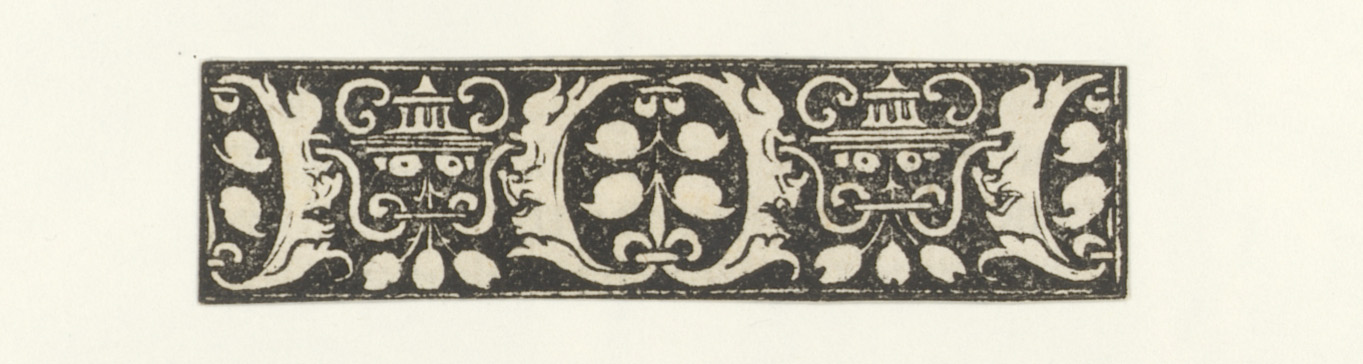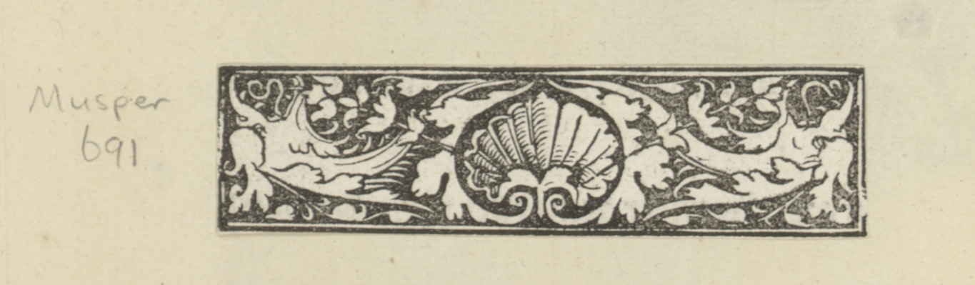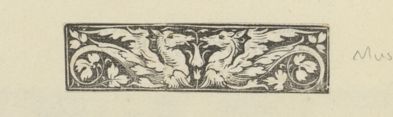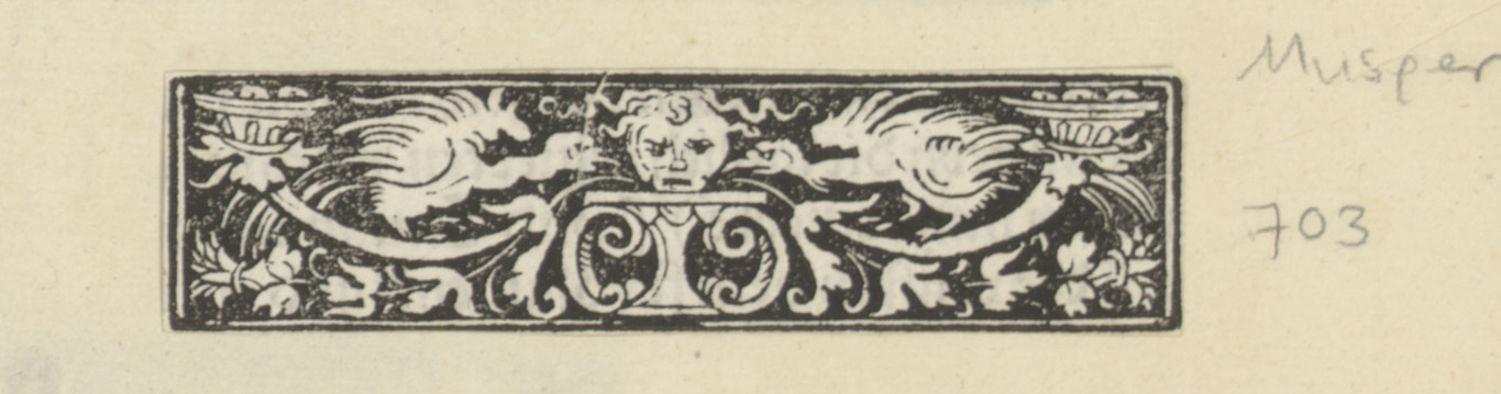 Hoofd op sokkel, twee vogels en ornamenten met bladm...