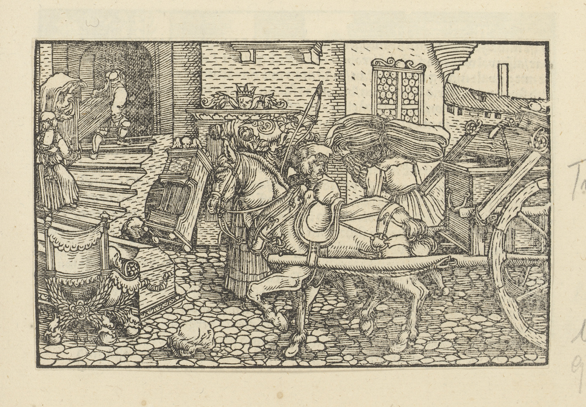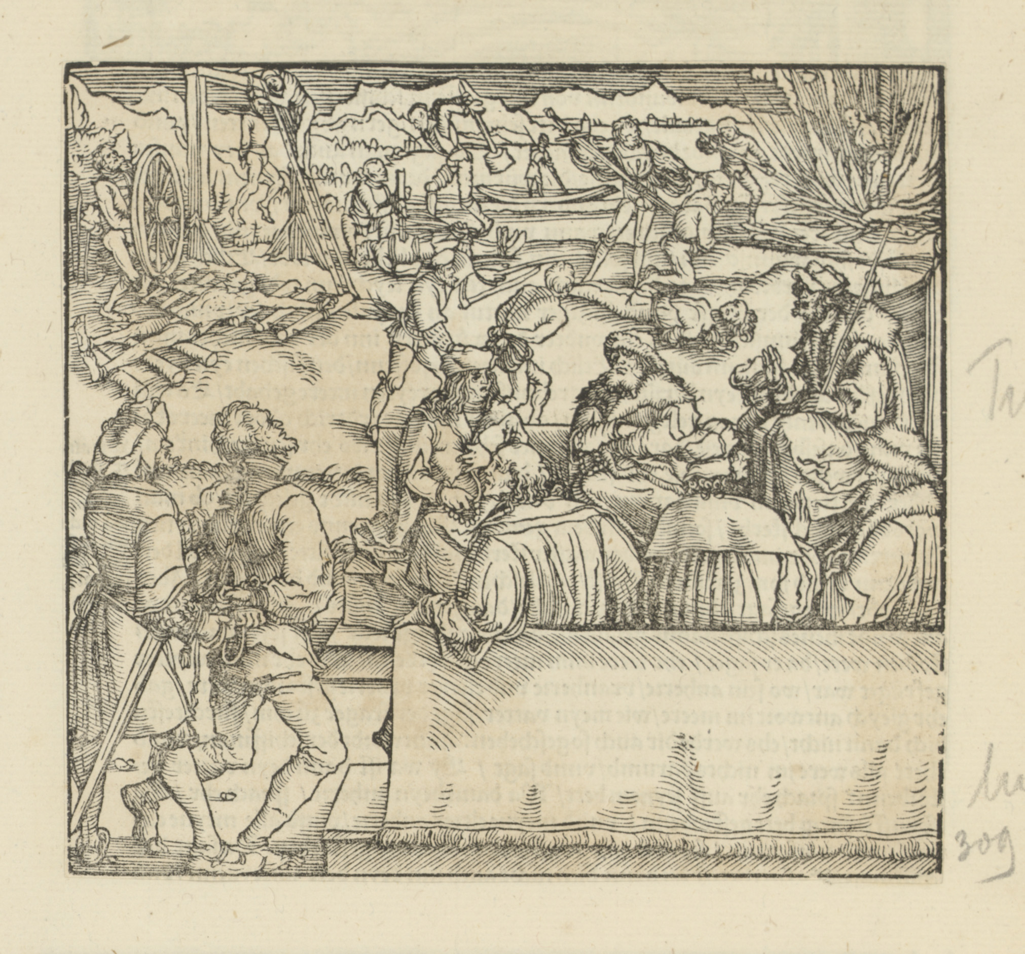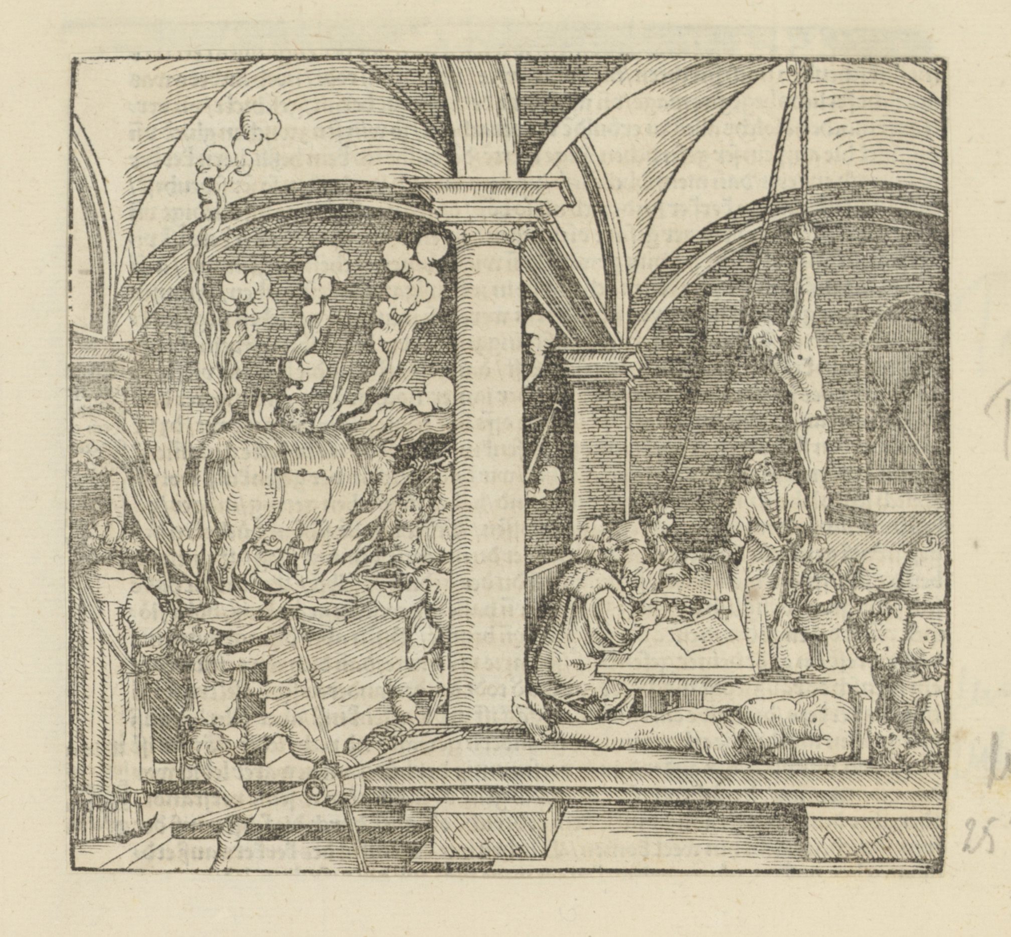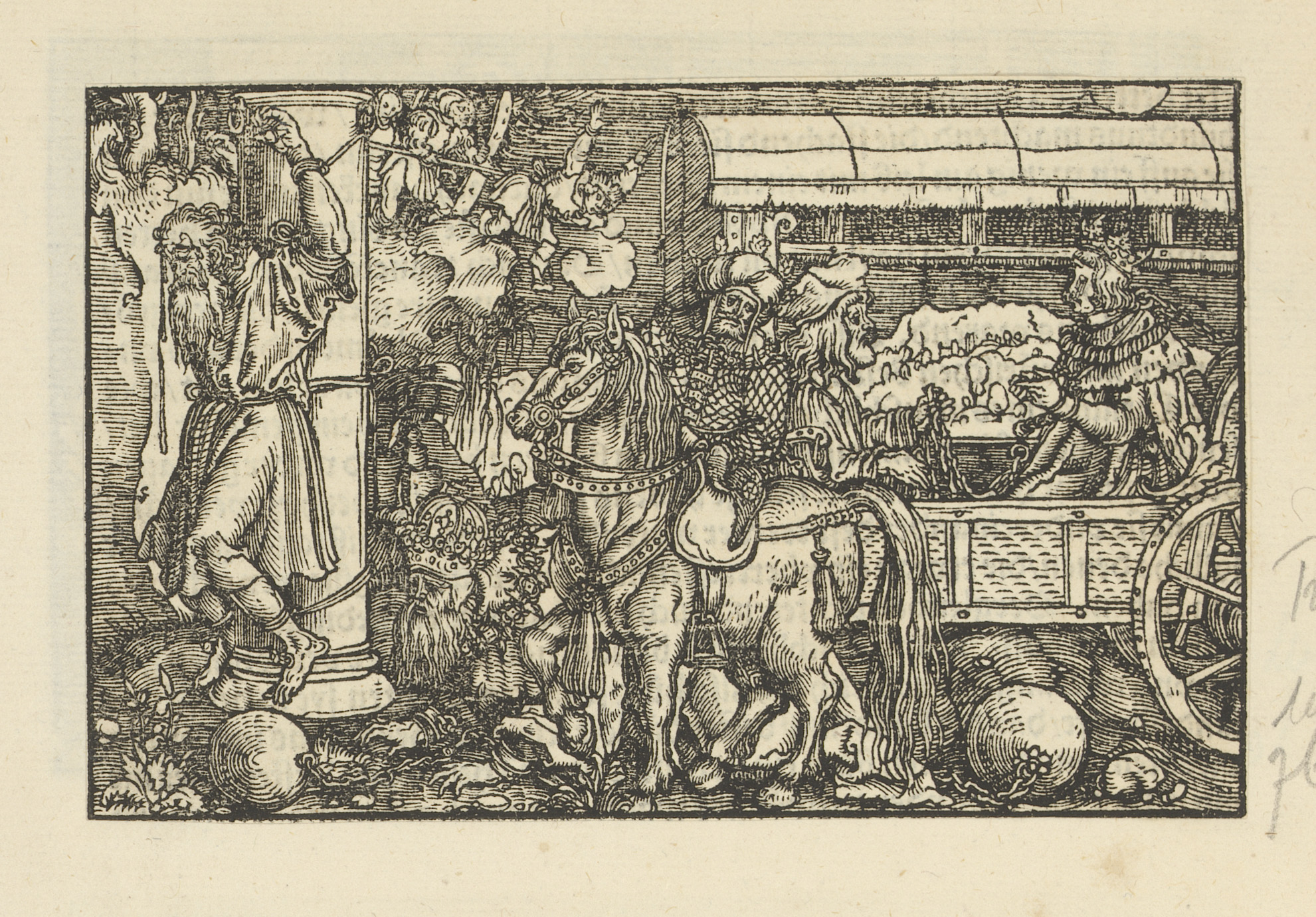 Aan een zuil gebonden man, man te paard en geboeide ...