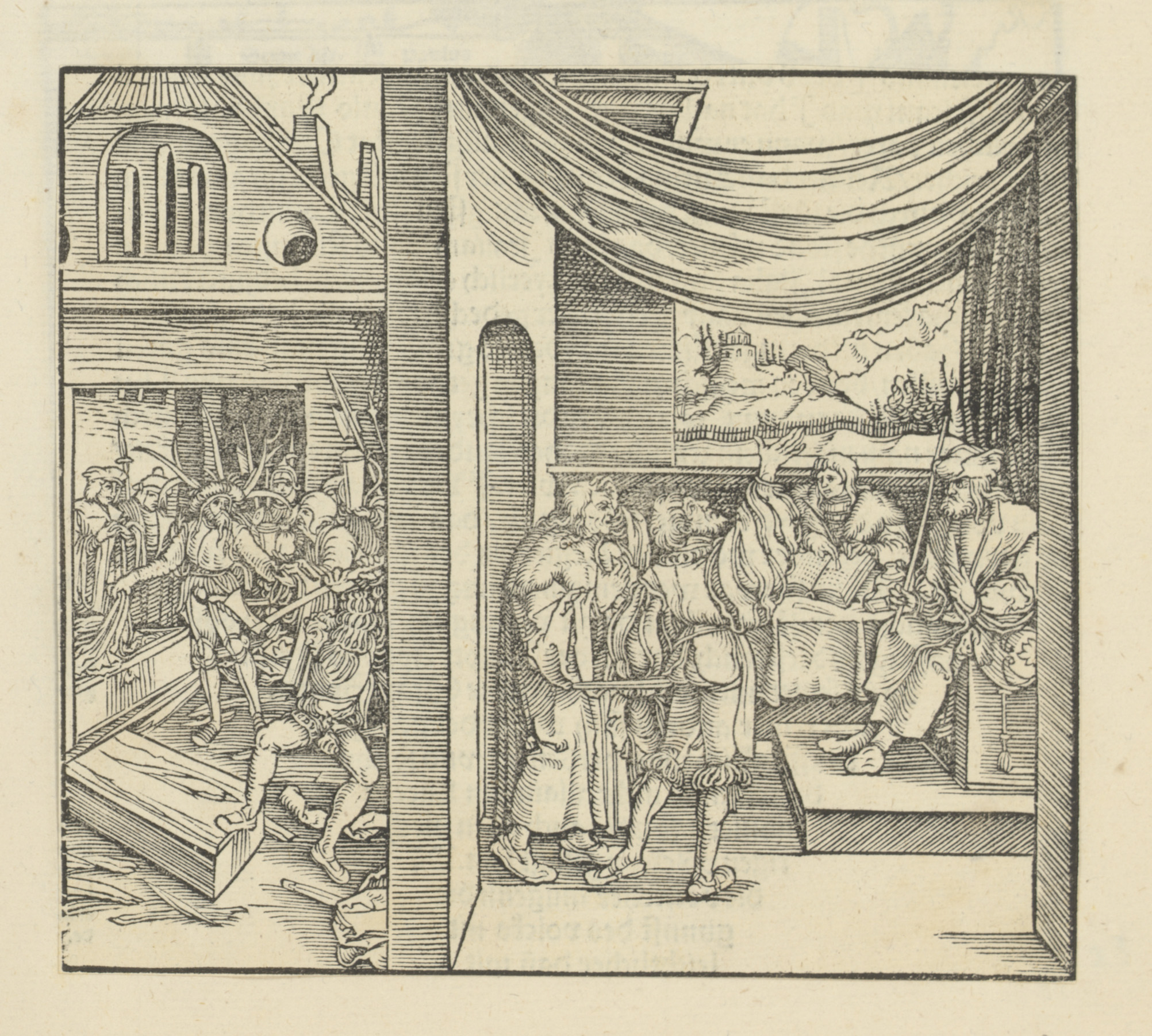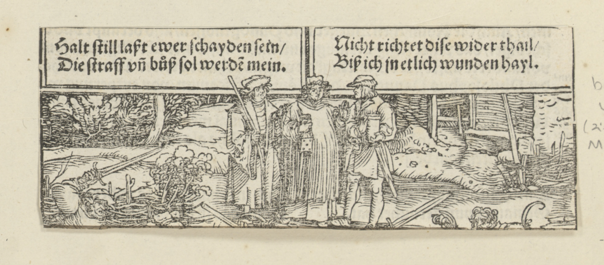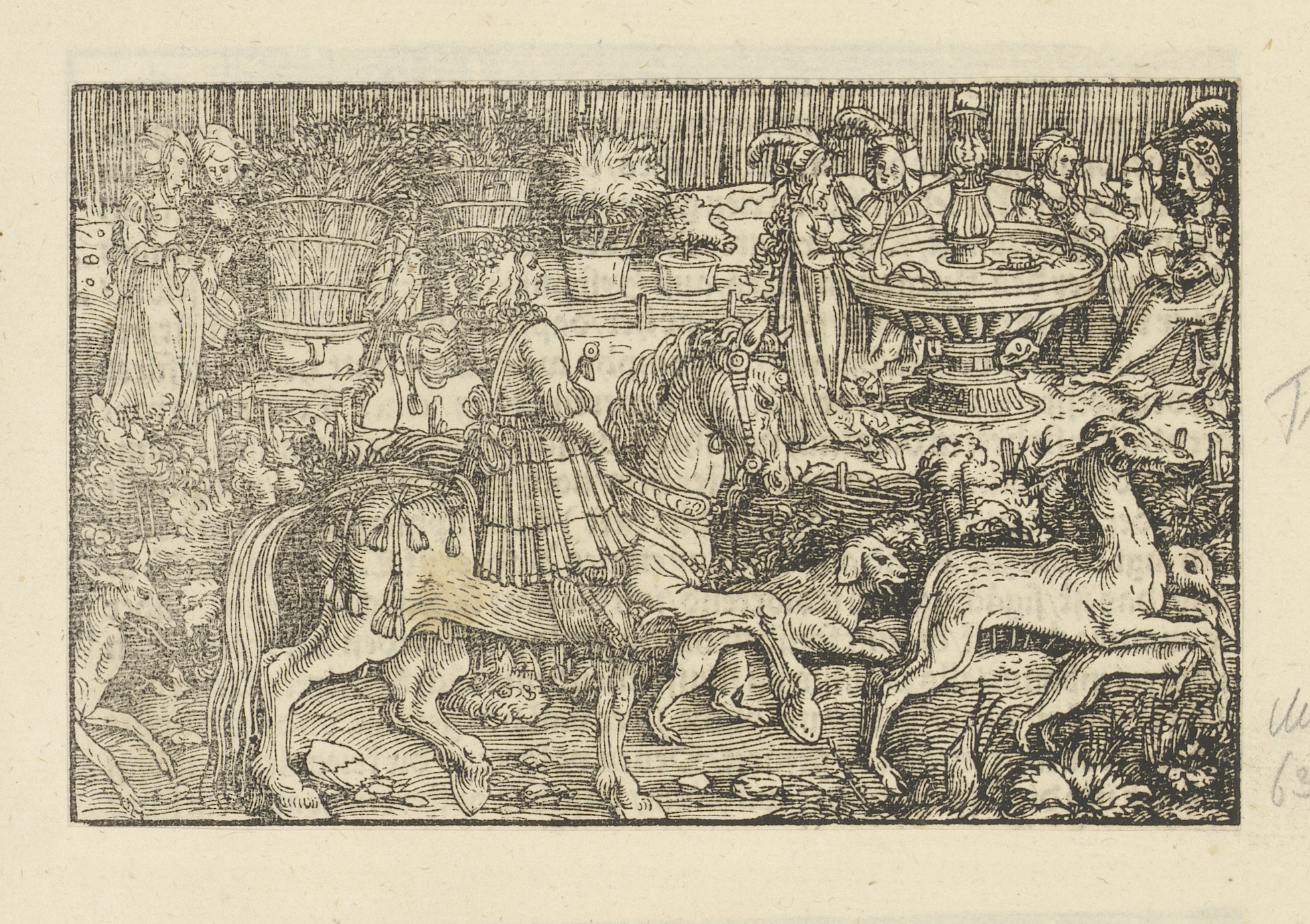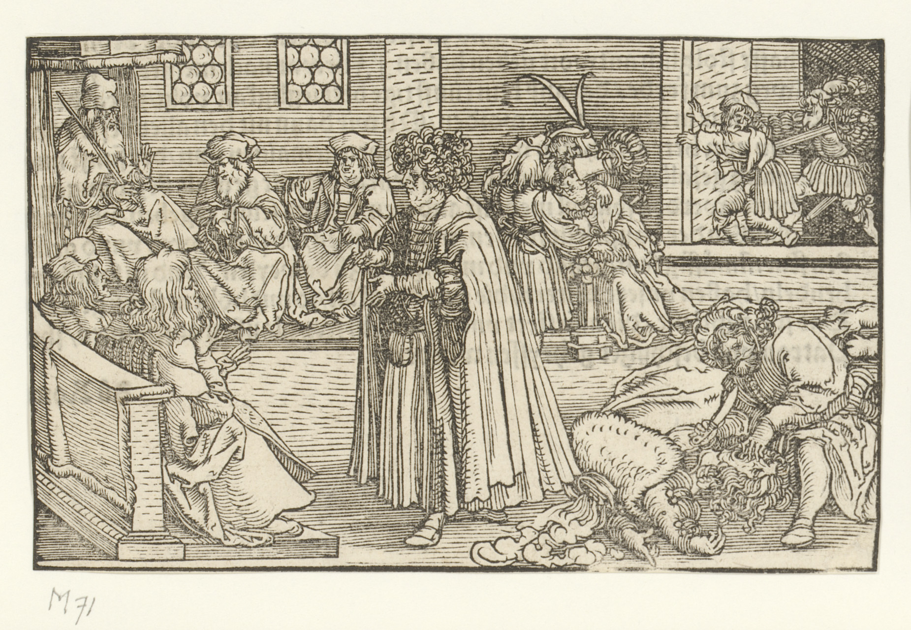 Aan een zuil gebonden man, man te paard en geboeide ...
