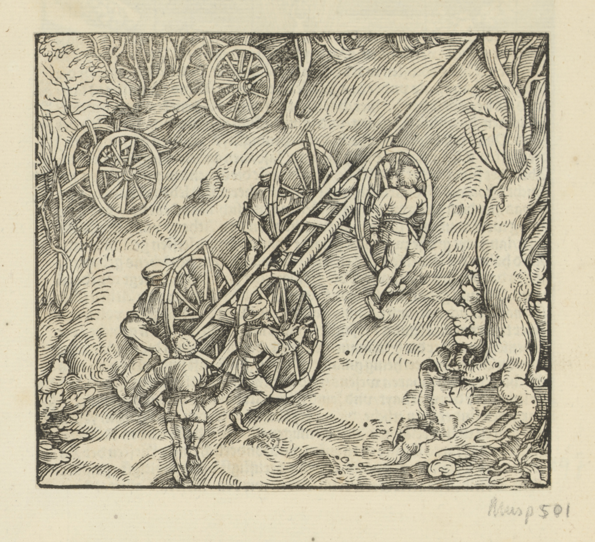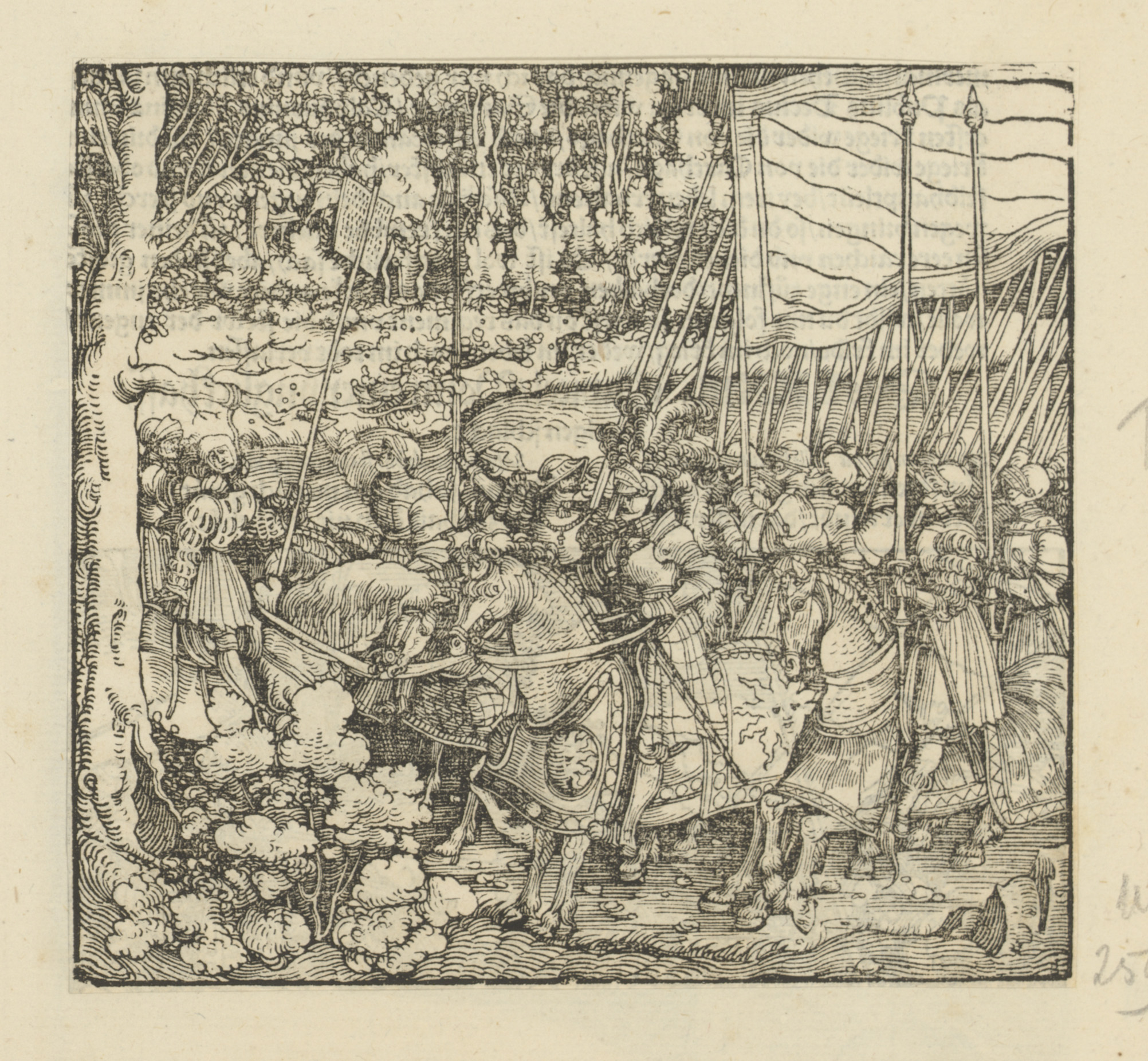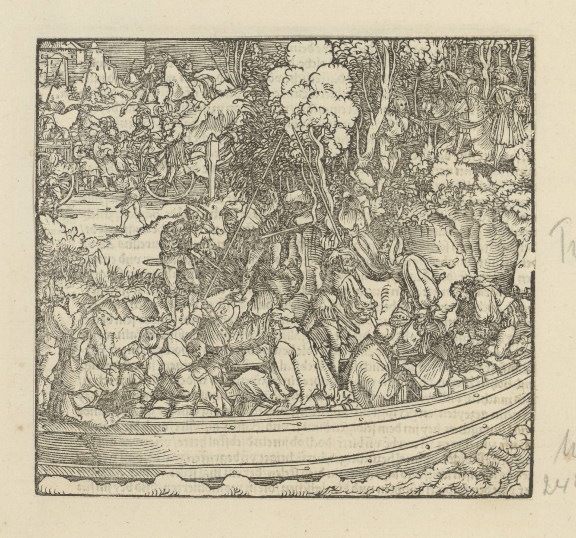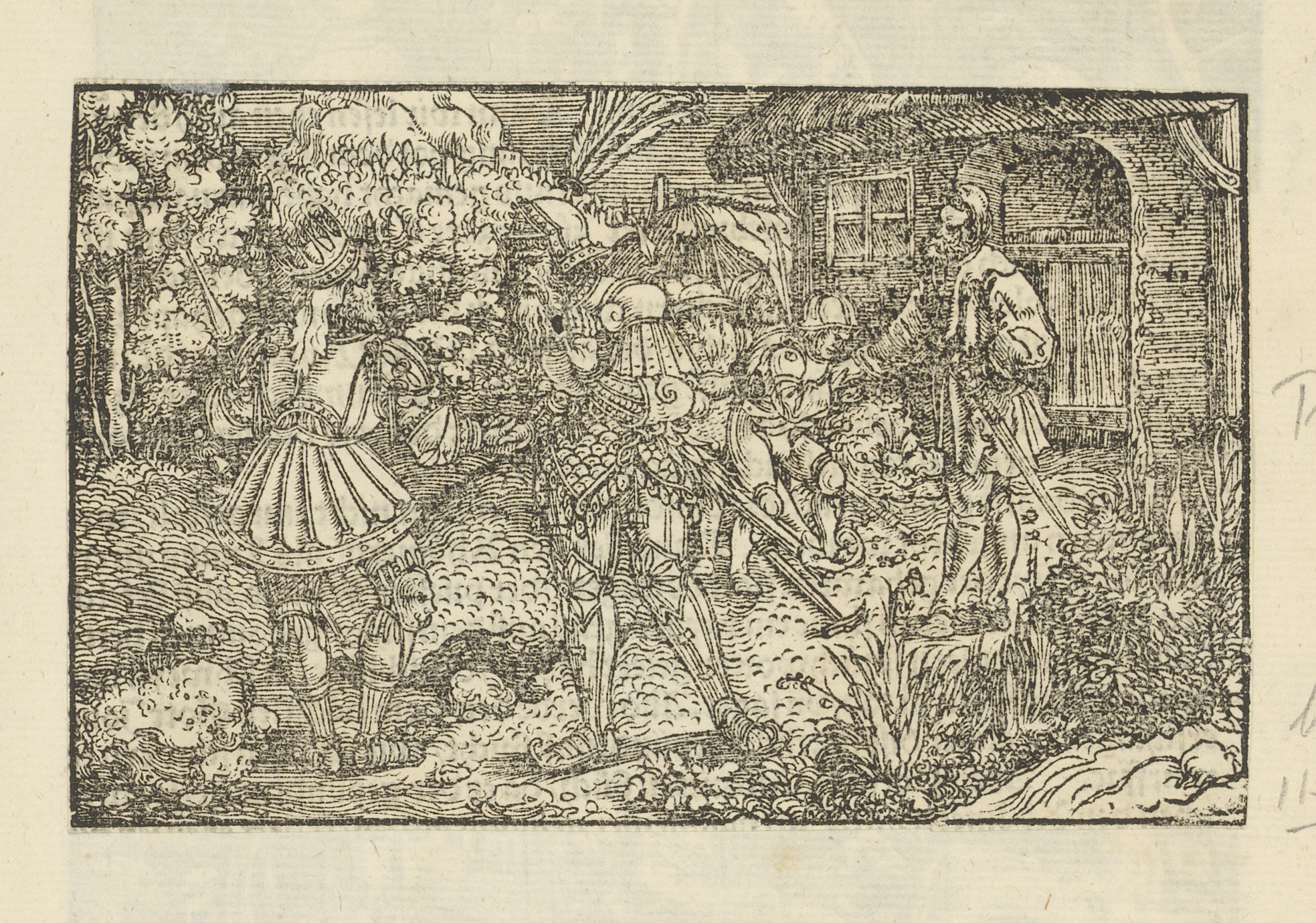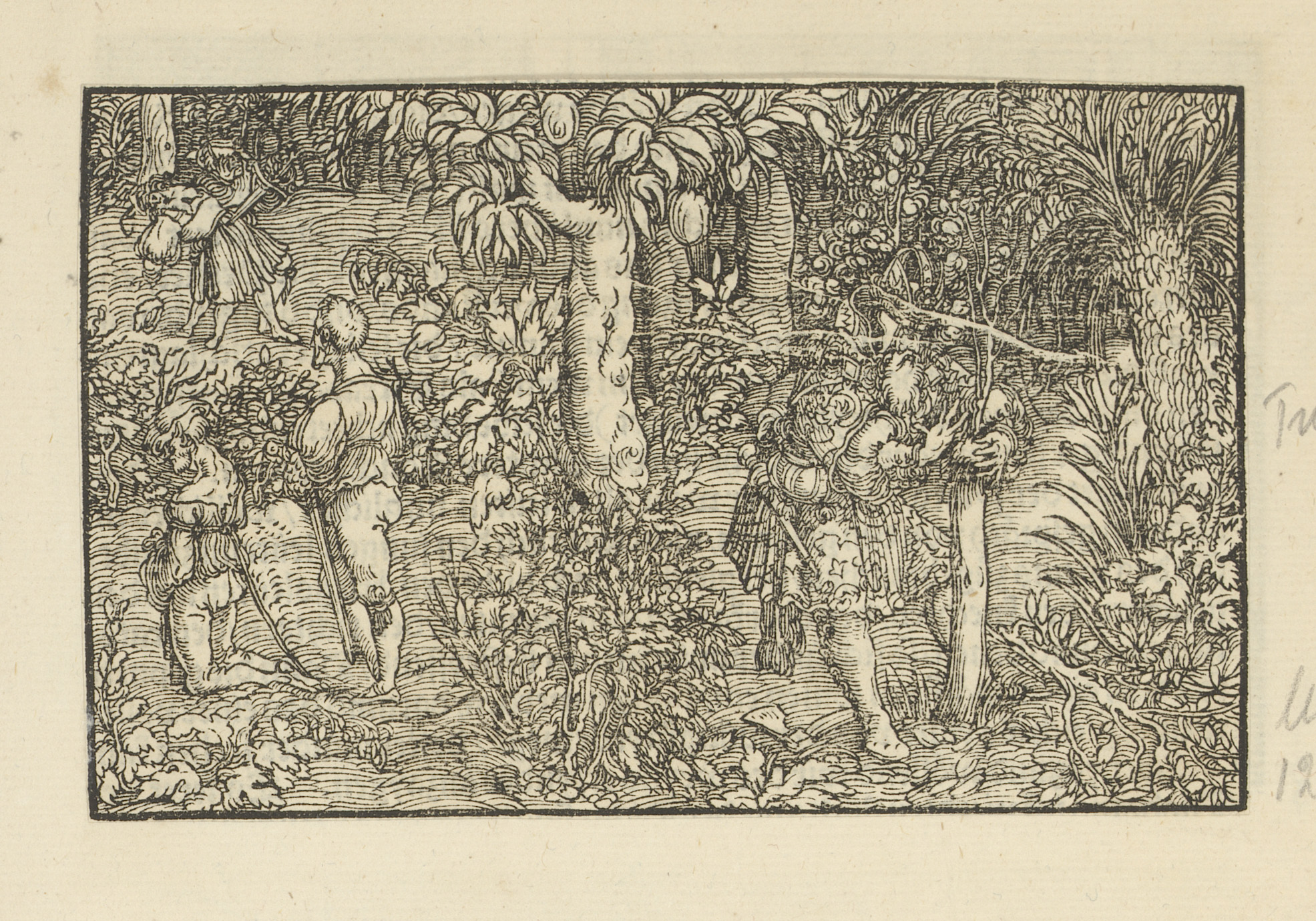 Soldaten bij een bos waar iemand aan een boom wordt ...