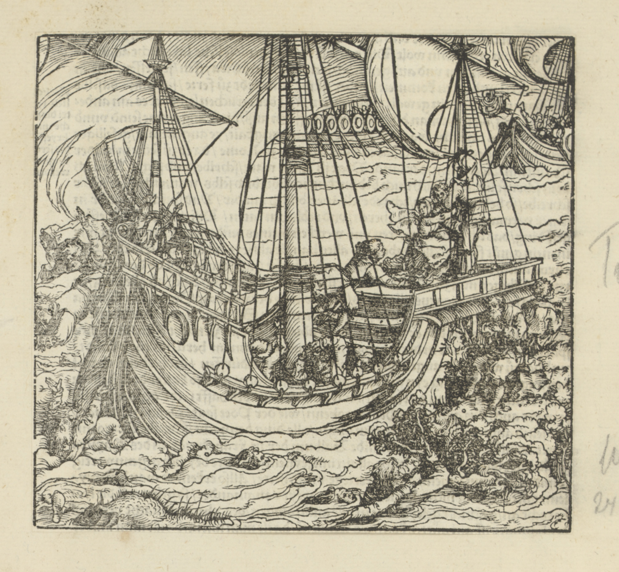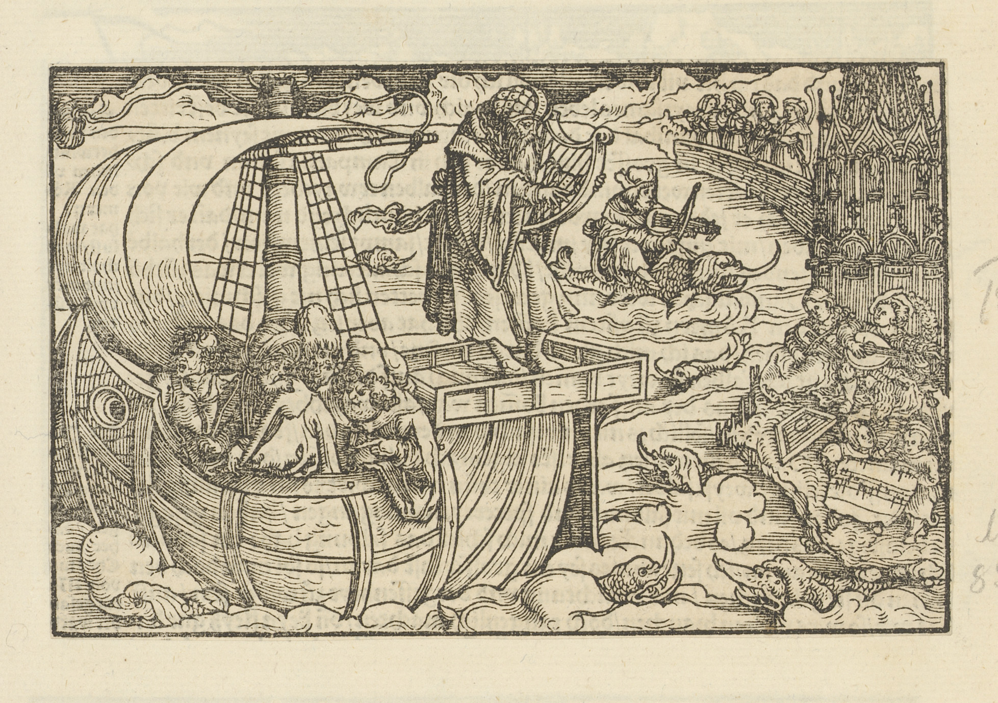 Schip met een harp spelende man op de boeg en een lu...