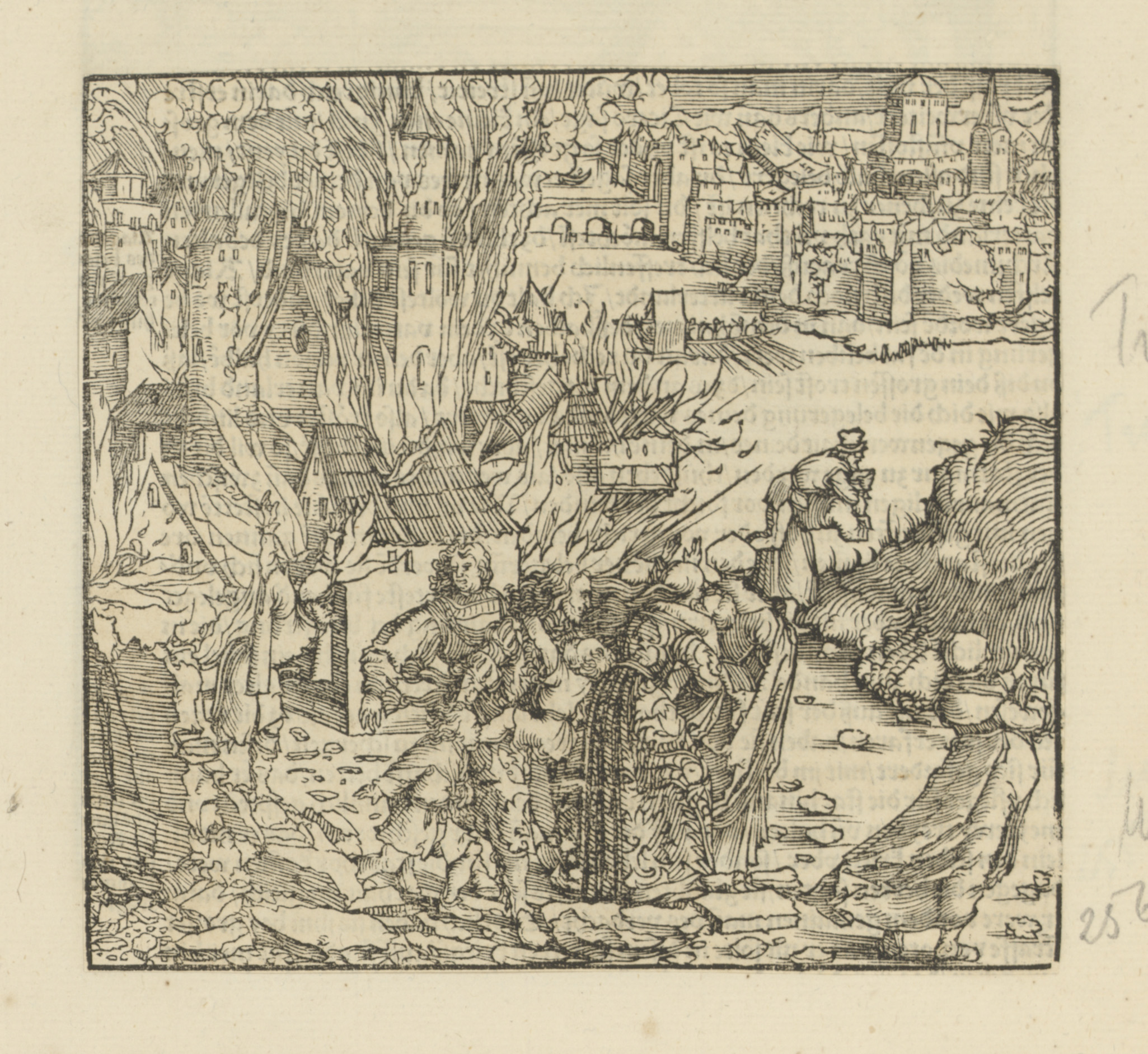 Mensen vluchten uit een brandende stad
