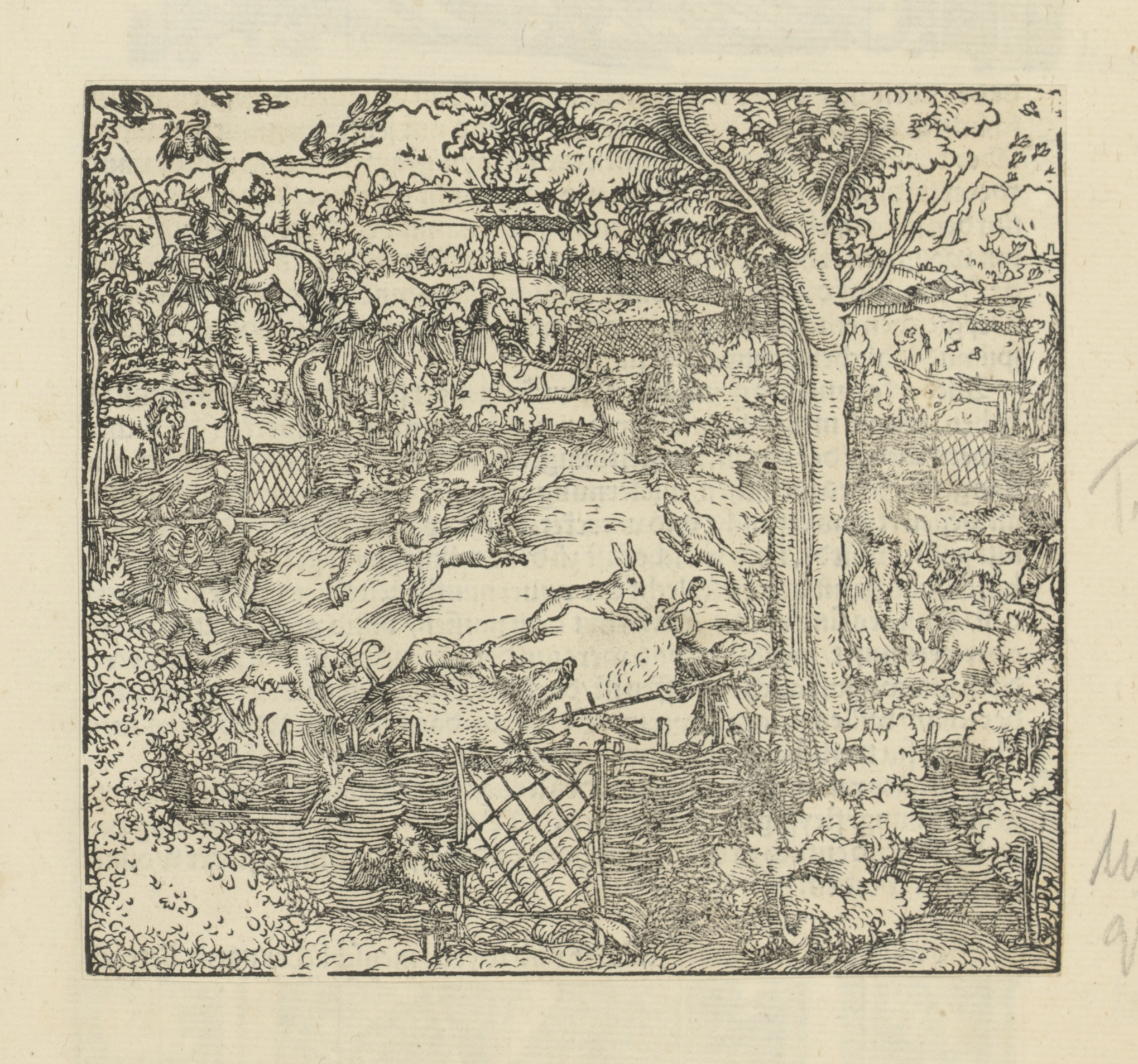 Jacht op zwijnen en konijnen in de hagen