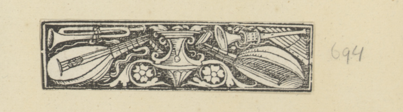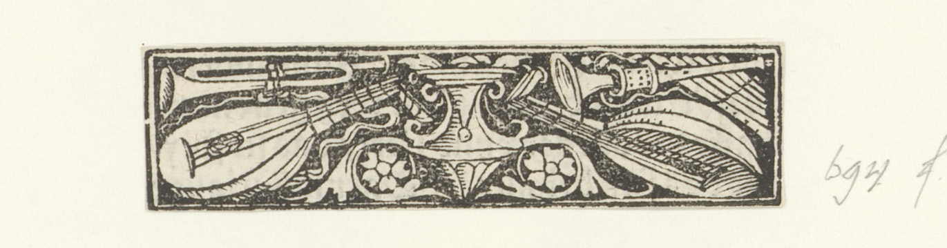 Vaas met aan weerszijden een luit en een trompet