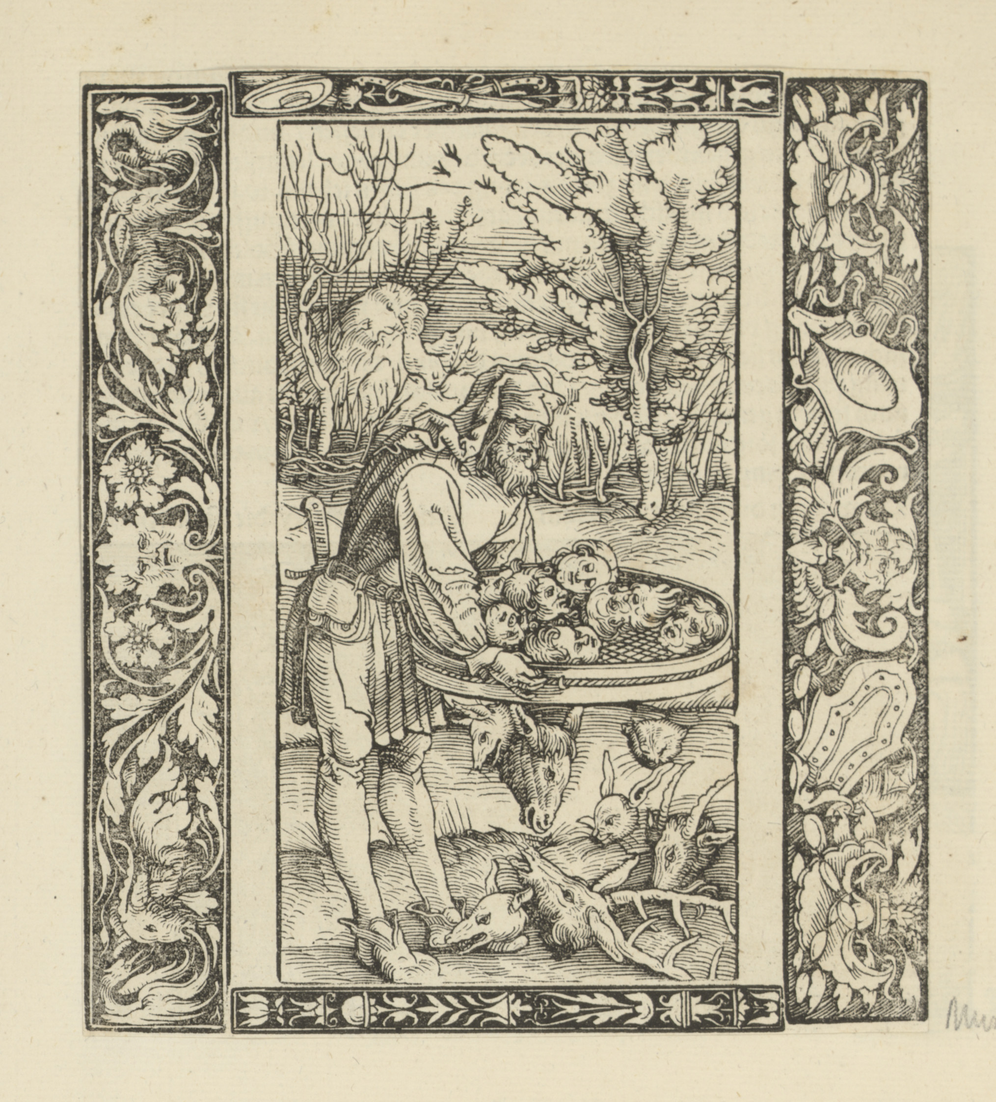 Landschap met een man die een mand vol mensenhoofden...