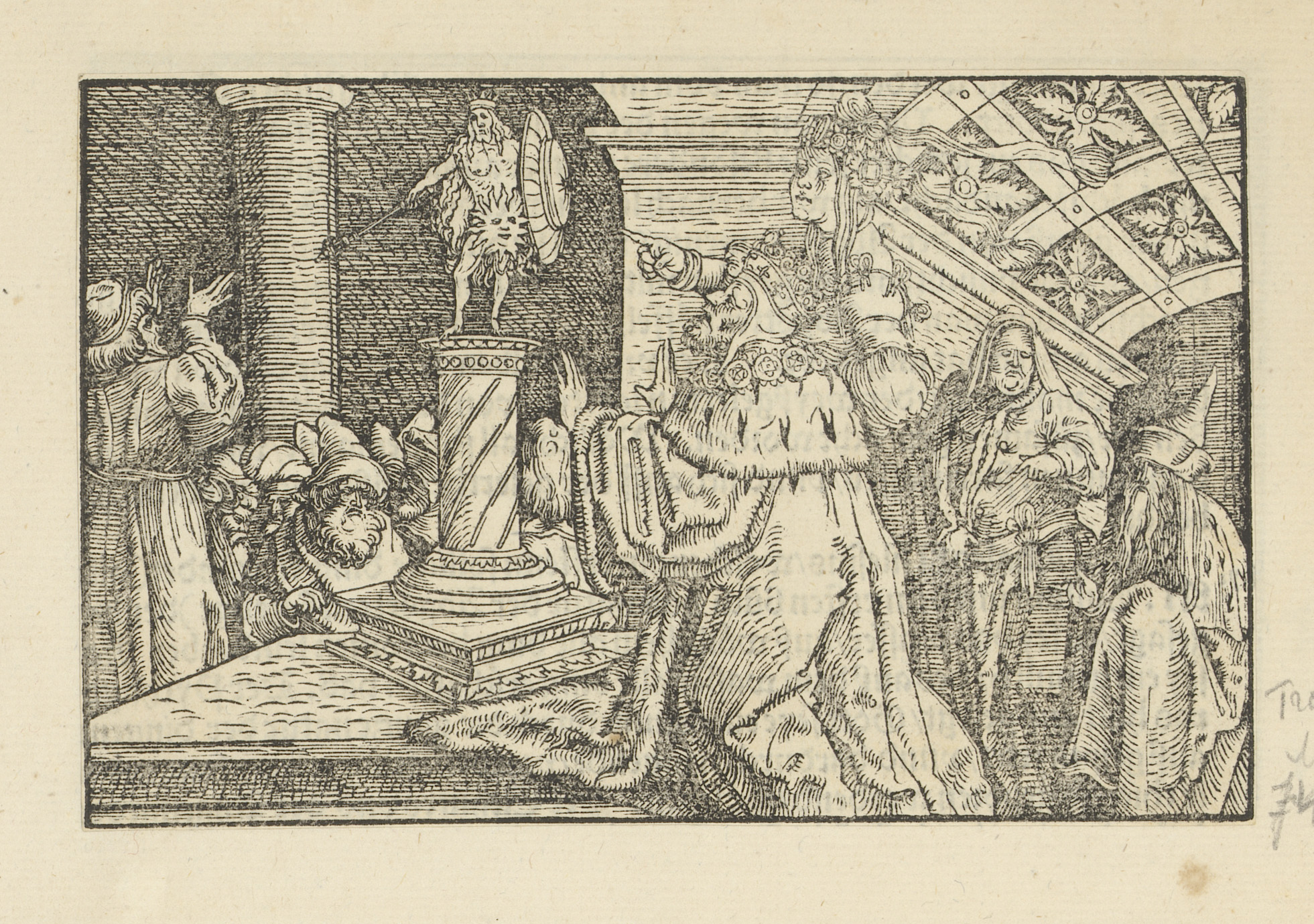 Koning bij een beeld op een sokkel
