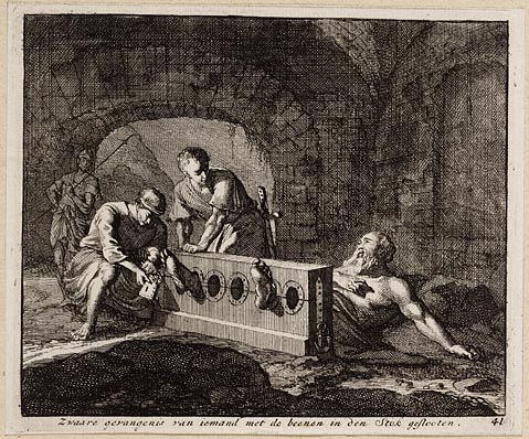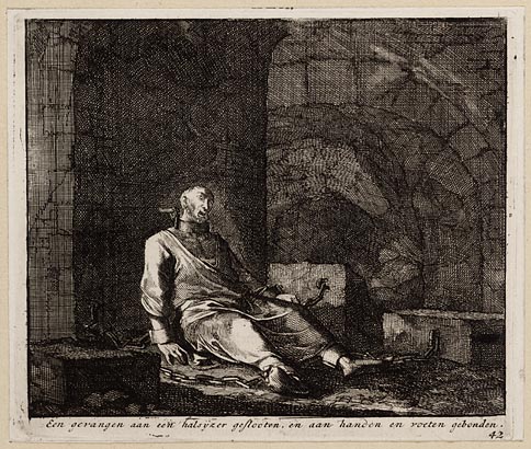 Een gevangen aan een halsijzer geslooten, en aan han...