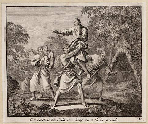 Een bezetene tilt Hilarion hoog op van de grond