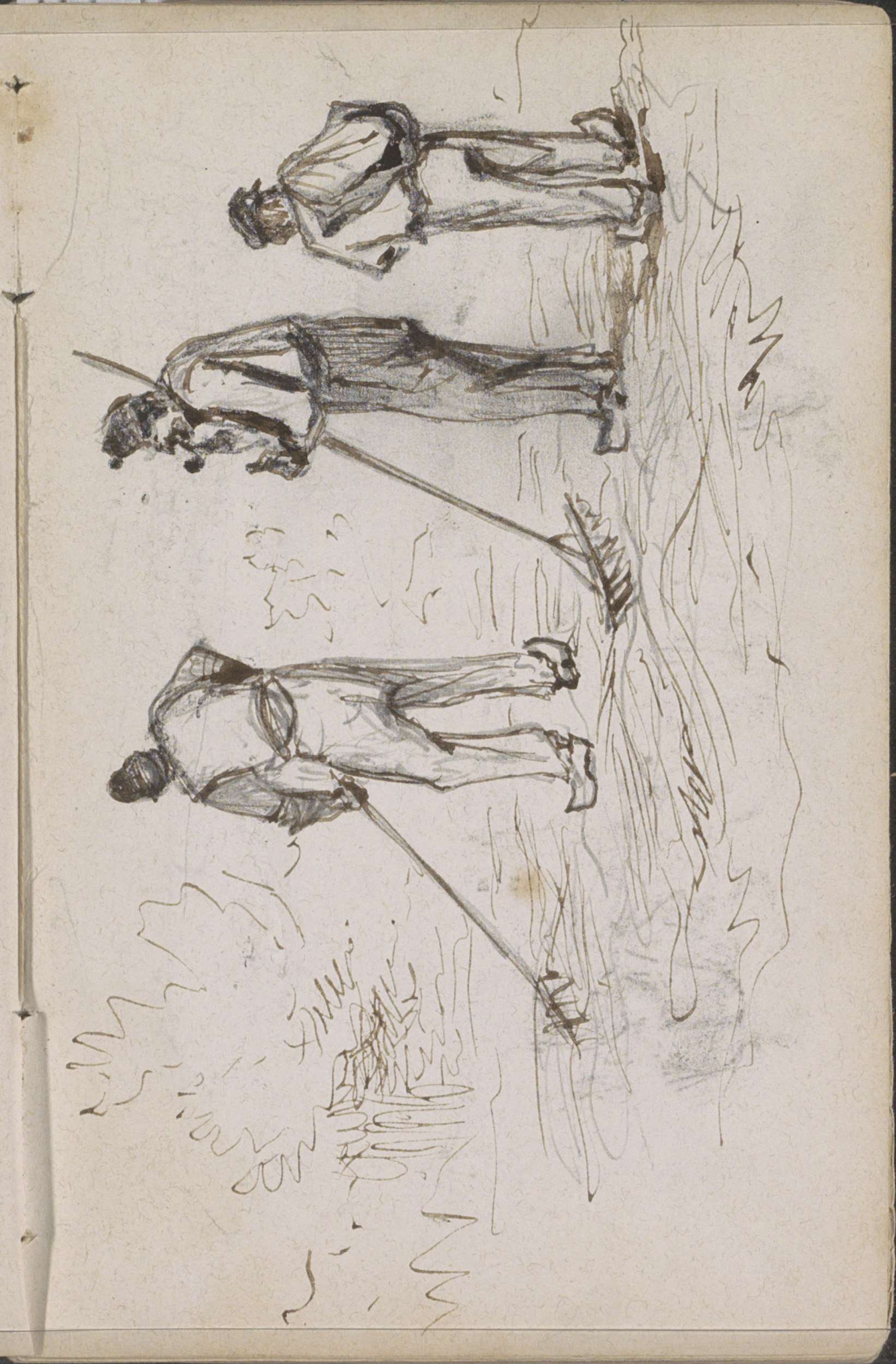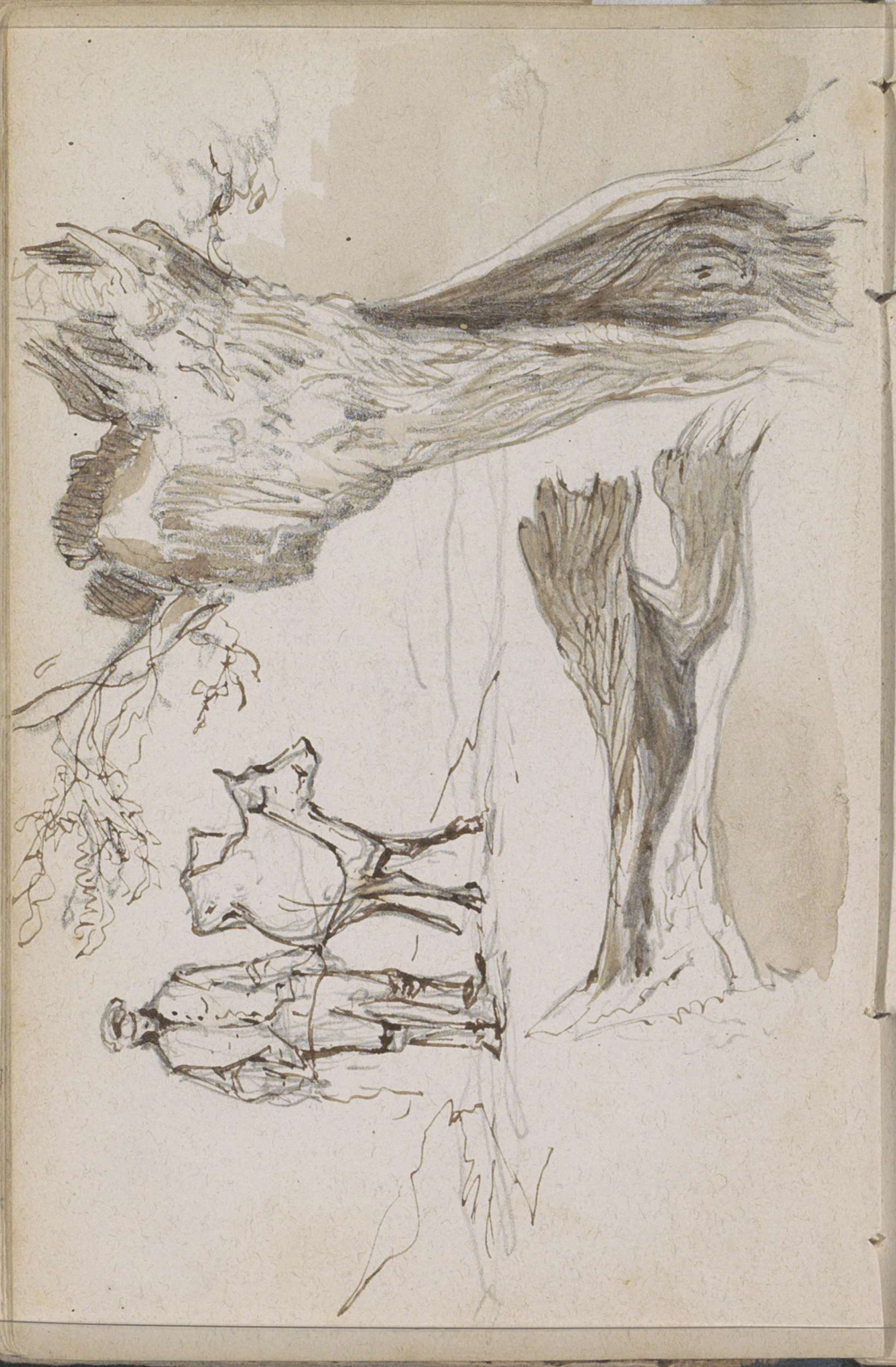 Boomstammen en een man met een koe aan een touw
