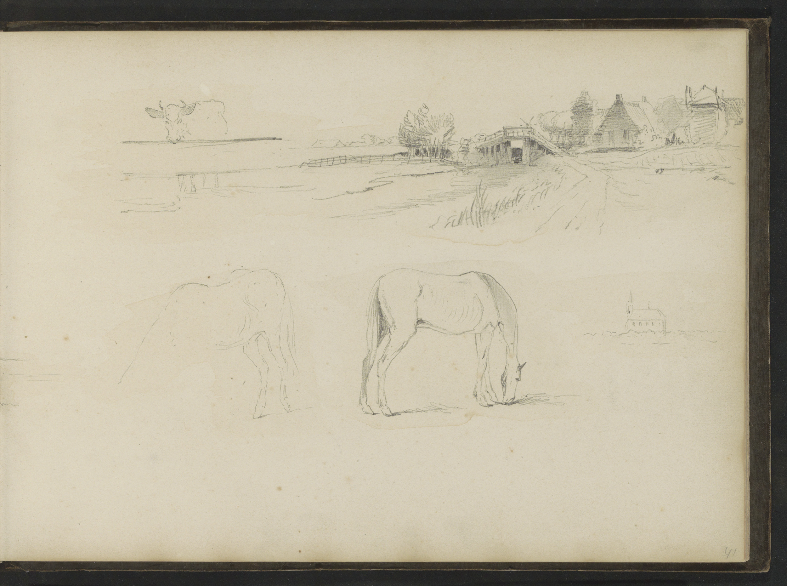 Huizen bij een sloot, paarden en een koe bij een hek