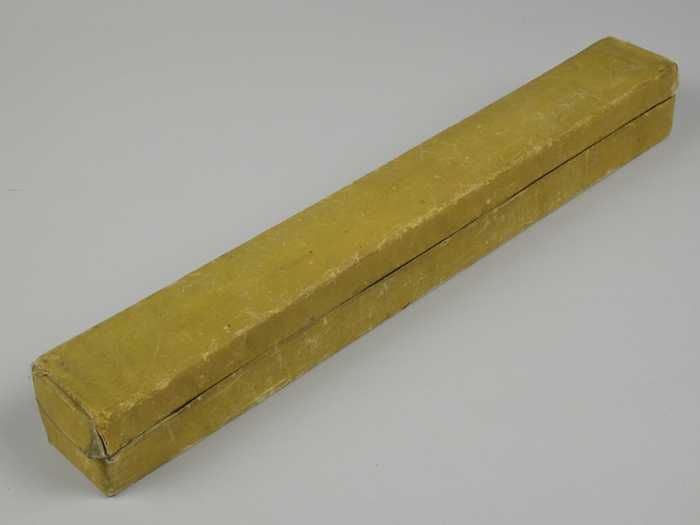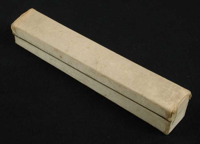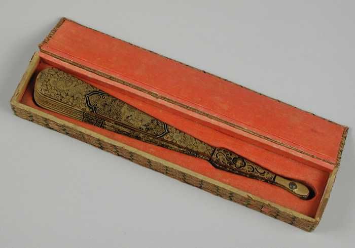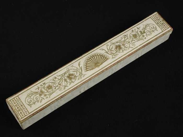 Kartonnen waaierdoos bekleed met crèmekleurige zijde...