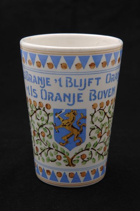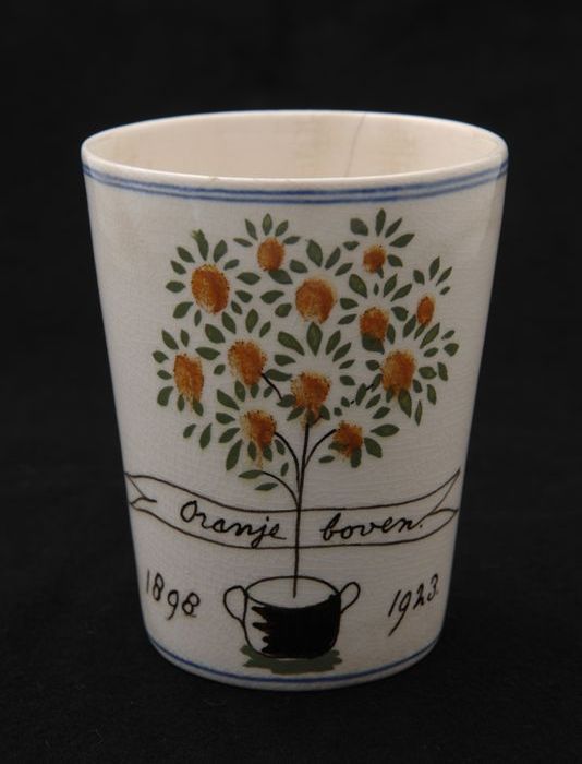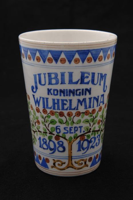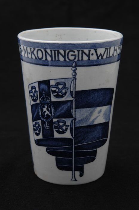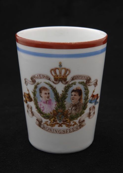 Witte beker met portretten van Wilhelmina en Emma in...