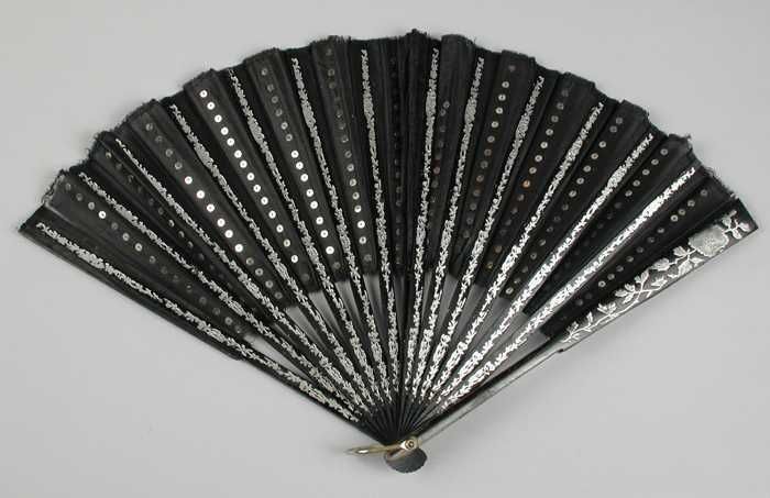 Zeer kleine waaier met zwart stoffen blad met zilver...