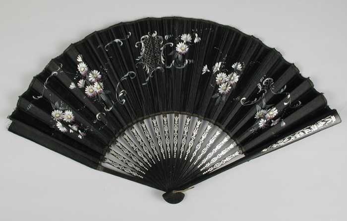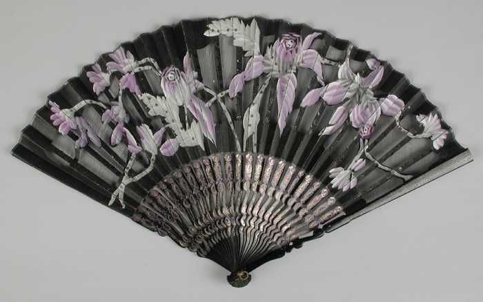 Zwarte waaier met zilver bewerkte benen en met bloem...