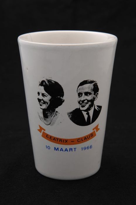 Witte beker met fotoportretten en "BEATRIX - CLAUS /...
