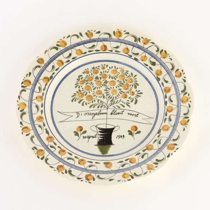 Meerkleurige jubileumbeker met sinaasappelbomen, wap...