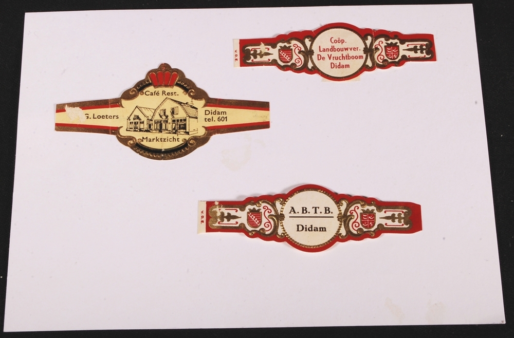 Drie sigarenbandjes van papier met reclame van bedri...