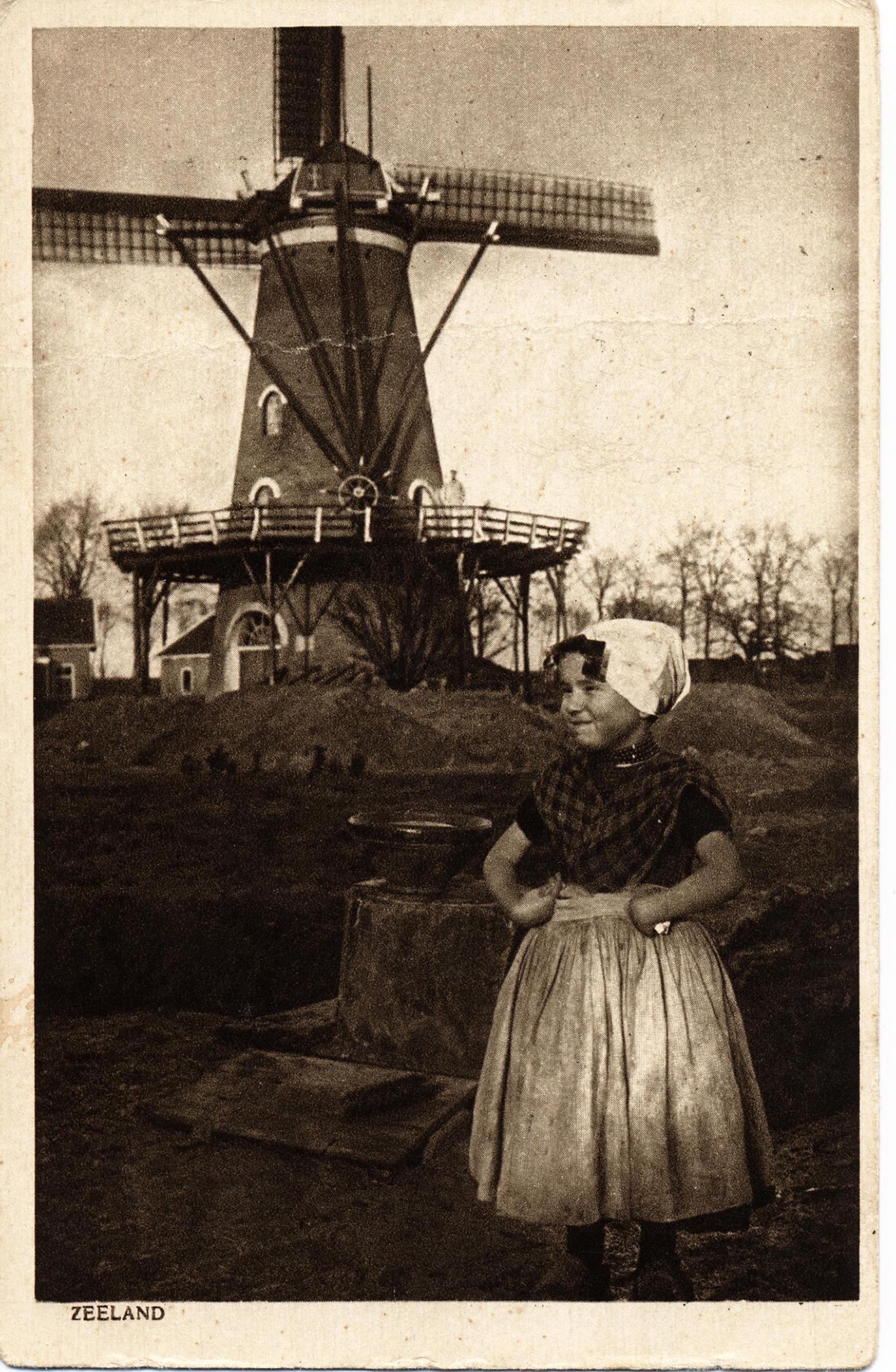Meisje in Zuid-Bevelandse streekdracht bij molen Noo...