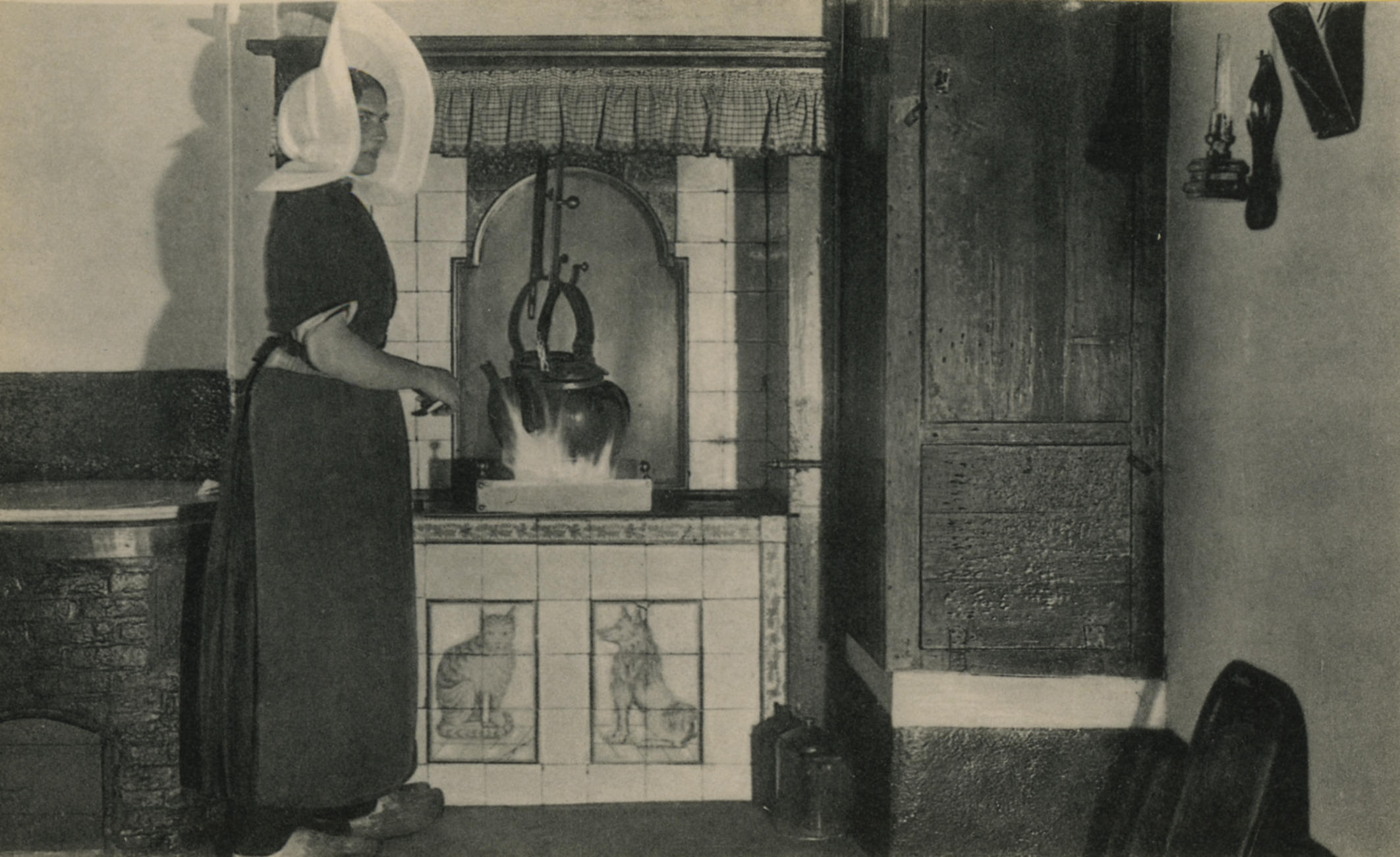 Vrouw in Huizer dracht bij schouw (ansichtkaart)