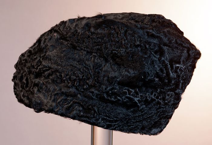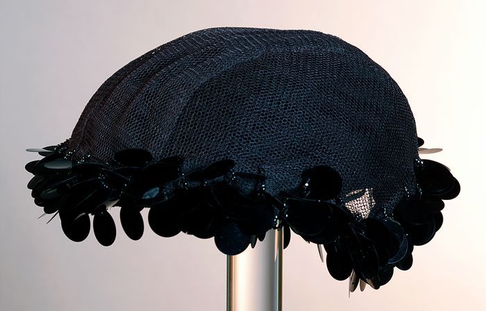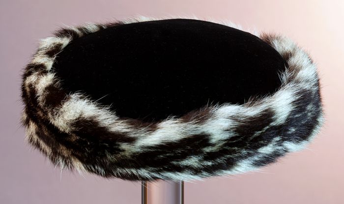 Pillbox, platte ronde dameshoed van zwart velours op...
