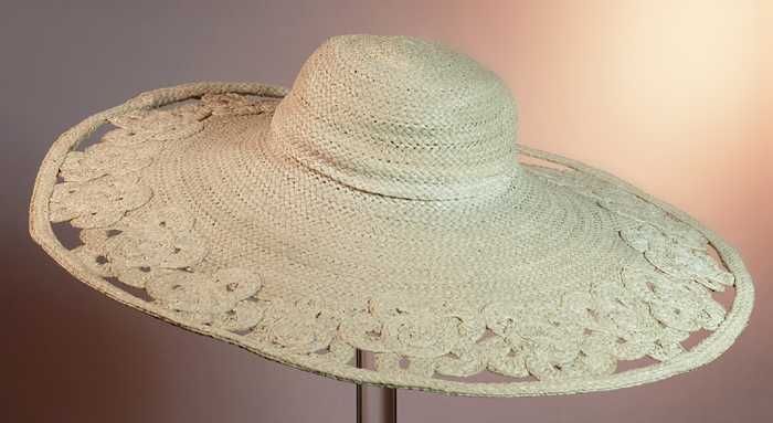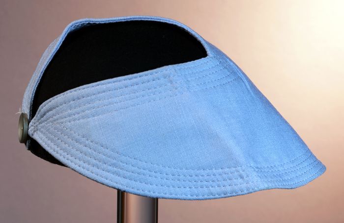 Zonnehoed, lichtblauw linnen doorgestikte band met d...