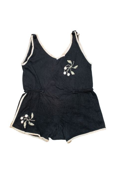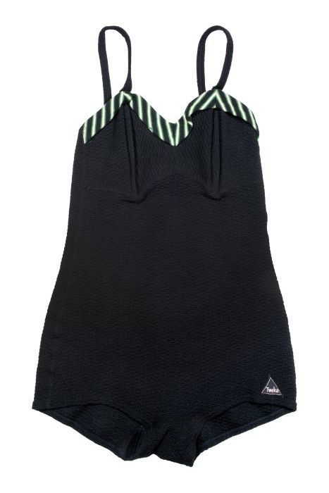 Zwart damesbadpak met groen en ecru langs de bovenra...