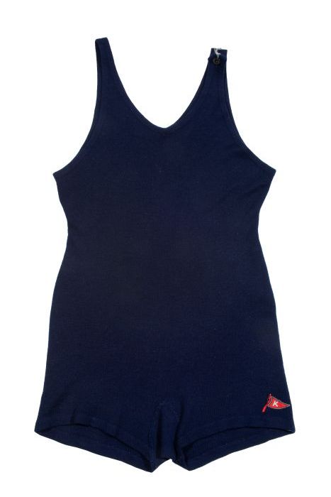 Donkerblauw tricot heren zwempak met rood vlaggetje "K"