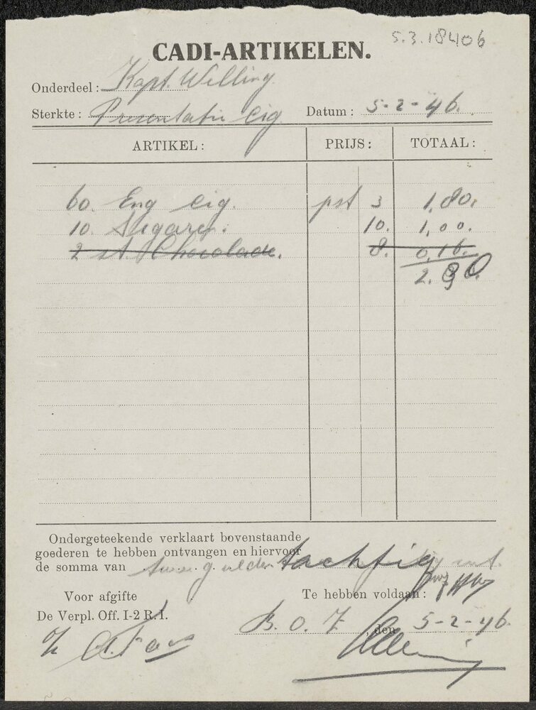 Rekening Cadi artikelen (60 Eng. cig, 10 sigaren en ...