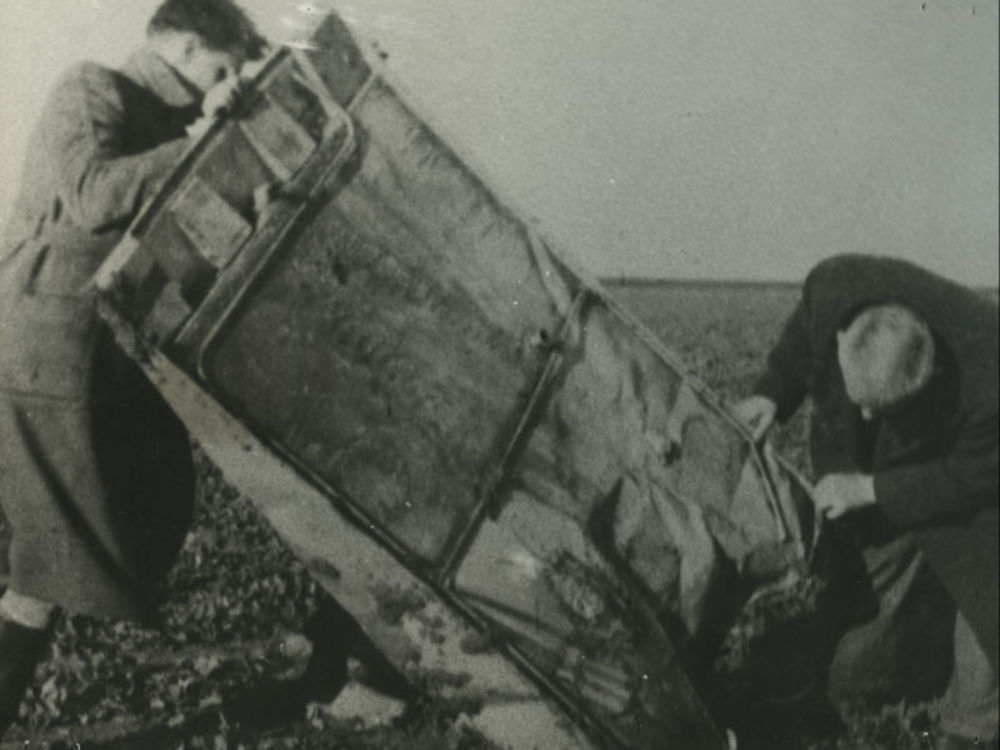 Twee man met wigvormig ding in weiland. Tekst achter...
